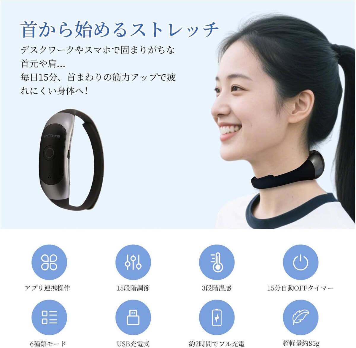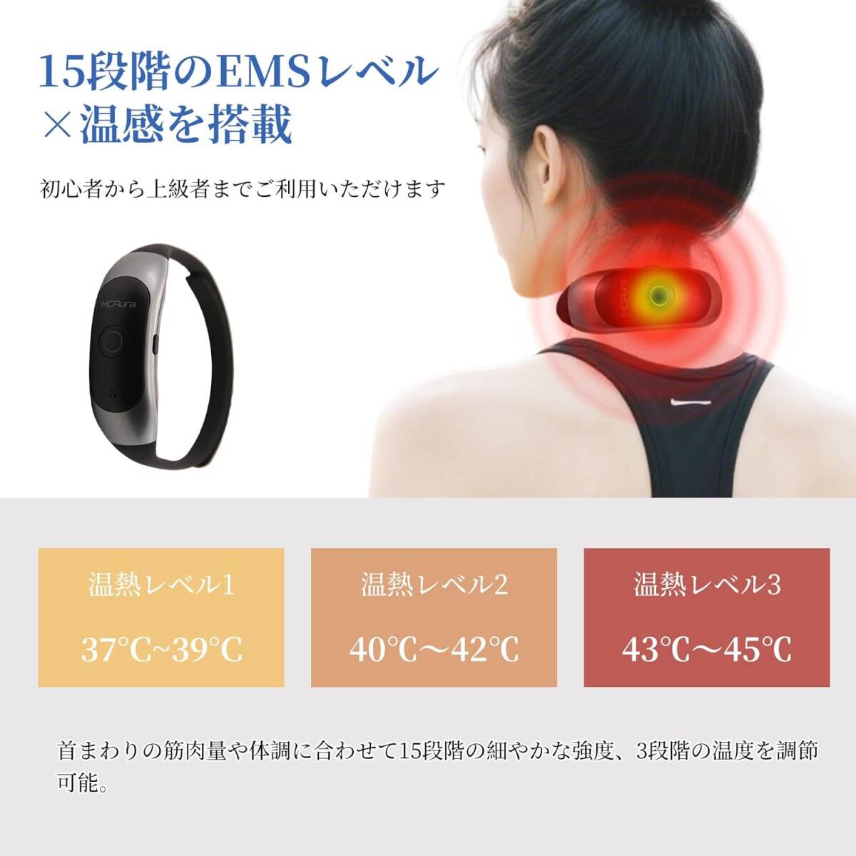 首と肩のケアのために設計されたリラクゼーション器です。EMS機能:15段階の強さ調整が可能。やさしい刺激からしっかりした刺激まで、自分に合ったレベルを選べます。リズムモード:6種類のバリエーション豊かな刺激で首や肩を心地よく刺激し、快適なセルフケアをサポート。温熱機能:37〜45℃の3段階調整。まるで蒸しタオルを当てているようなぬくもりで首元を包み込みます。ネックウォーマーとして、特に寒い季節に首元をやさしく温めるアイテムとして活躍します。EMS・リズム・温熱を自由に組み合わせて、その日の気分やシーンに合わせたケアが可能。就寝前のひとときや在宅ワークの合間など、さまざまな場面で首元のリフレッシュをお楽しみいただけます。※初めてご使用の際は、レベル1からお試しください。