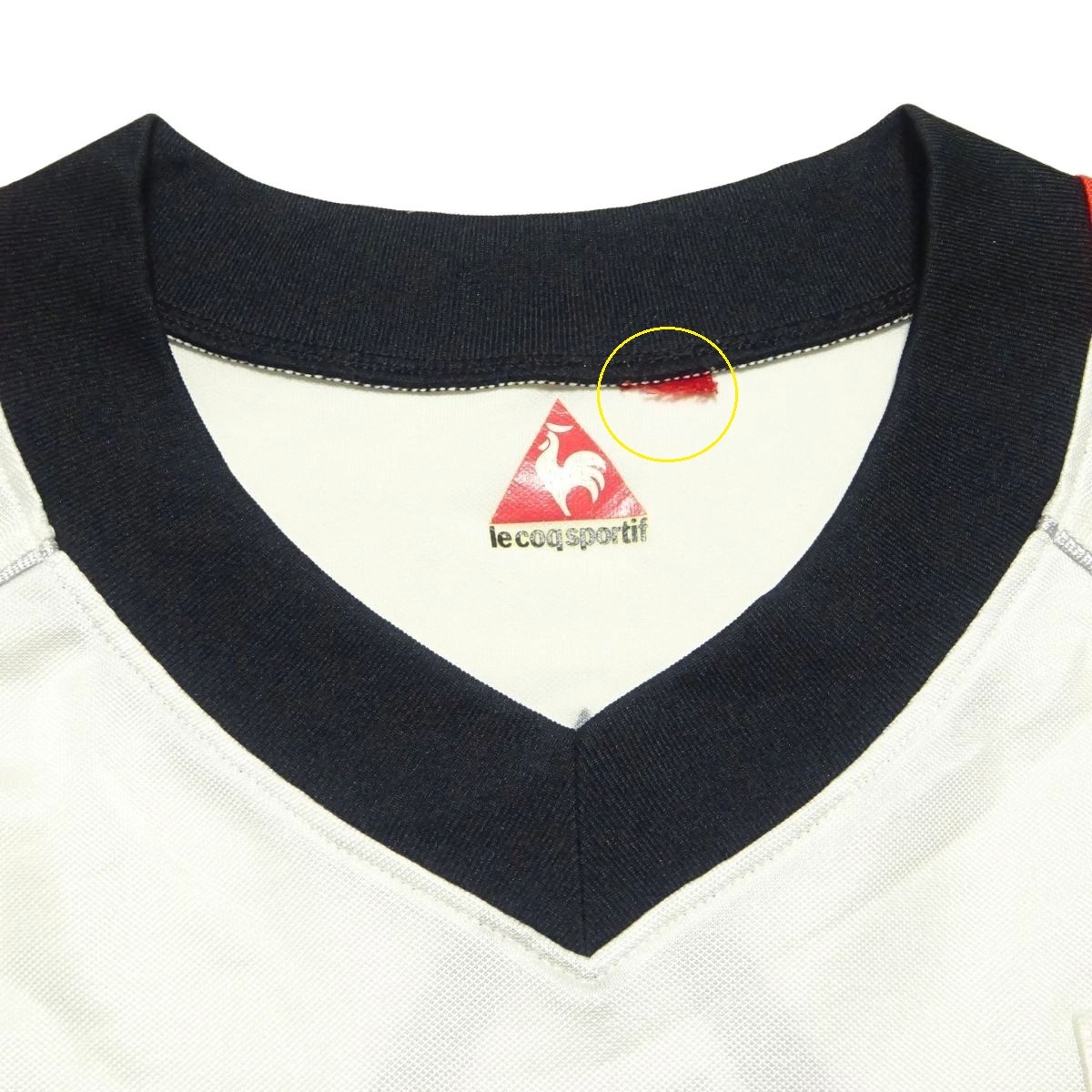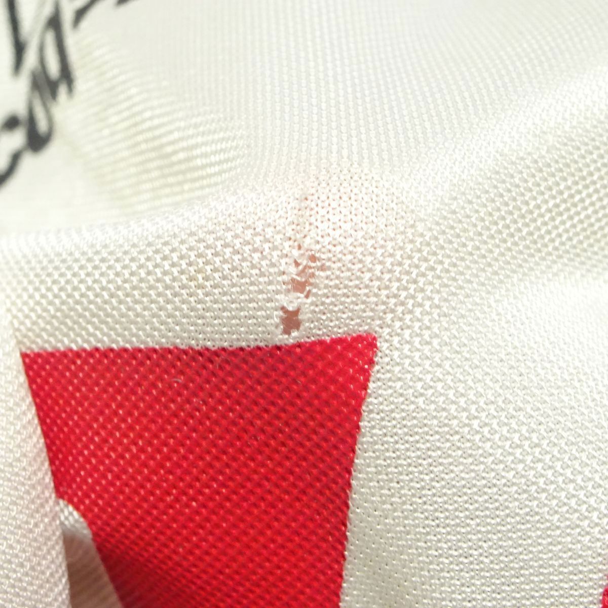 状態 それなりの着用感と胸に一箇所小さな穴、首内タグに破れ欠け、右肩にやや引きつりキズ(ともに画像○印)はありますが、気になるほどの汚れやダメージなどはなく並より劣る状態の品ながらまだご着用頂けると思います。