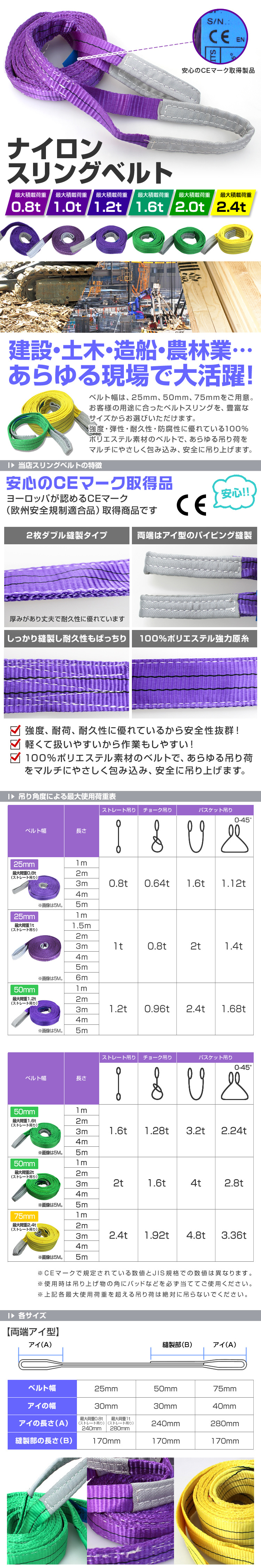 ◎強度、耐荷、耐久性に優れているから安全性抜群 ◎軽いので扱いやすい ◎ヨーロッパが認めるCEマーク(欧州安全規制適合品) 取得商品 ◎ポリエステル100% ◎両端アイタイプ 運送業・自動車産業・建設業・倉庫業・造園業・港湾業・造船業・林業 ・石材業・荷役業など様々な作業にお使いください。 【仕様】 ベルトサイズ:長さ1m×幅50mm 材質:ポリエステル100% 最大使用荷重(能力):ストレート吊2000kg、チョーク吊1600kg、バスケット吊4000kg CE規格品 【内容】 ナイロンスリングベルト(耐荷2t 50mm×1m) ×10本  |