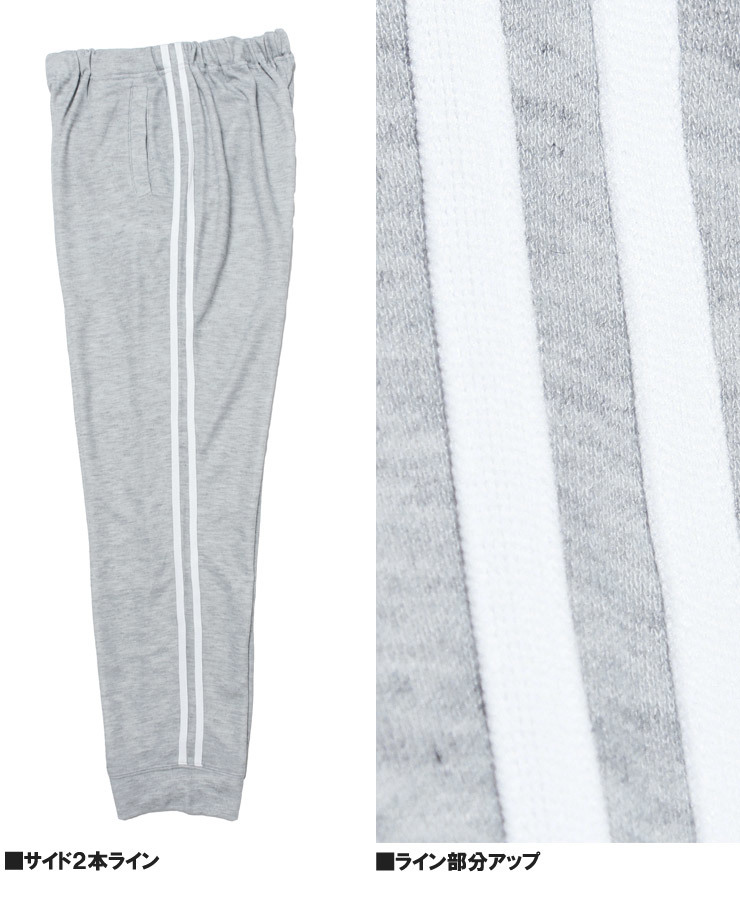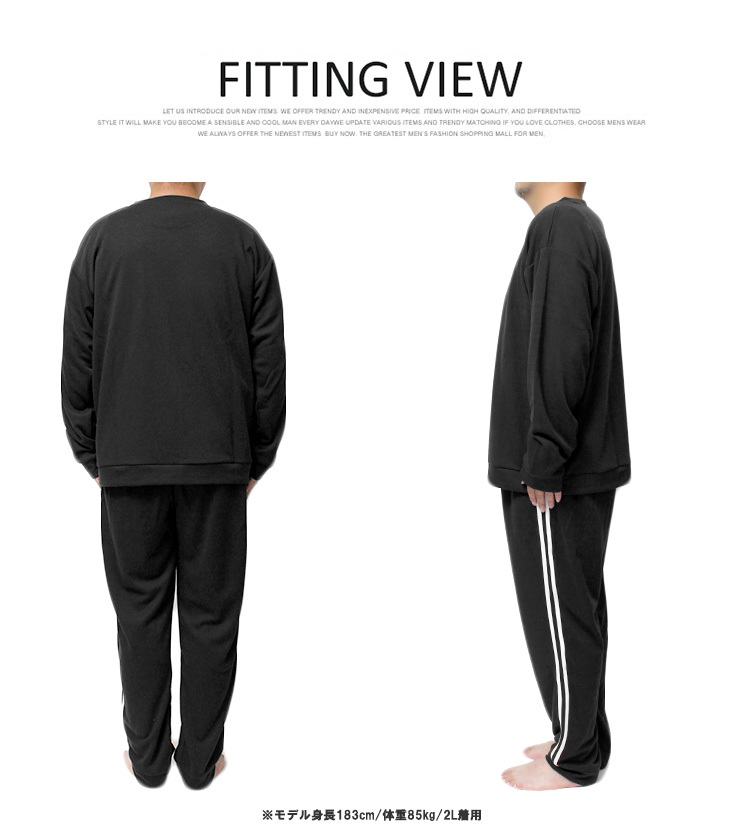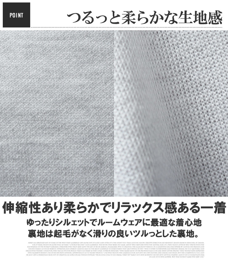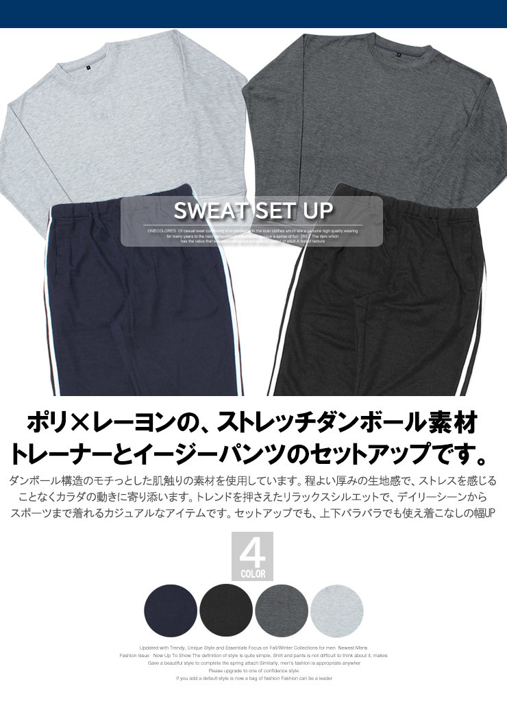 商品説明 | ポリエステル×レーヨンの、ストレッチダンボール素材のクルーネックトレーナーとイージーパンツのセットアップです。 |