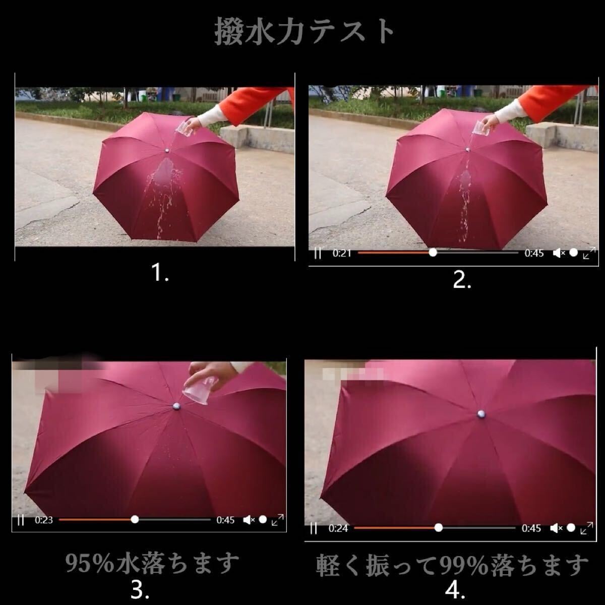 高密度ポリエステル素材を使用し、かつ防水性の高いテフロン加工を施された折りたたみ傘です。