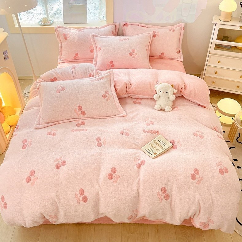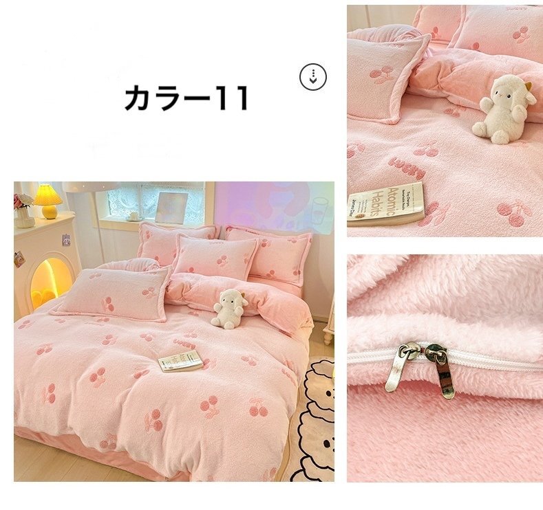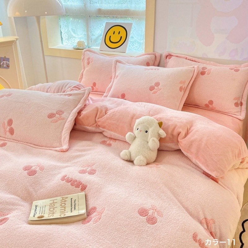 掛け布団カバーセット シーツ4点セット ボア 敷きカバー 枕カバー ベッド用 防寒 チェリー 柄 ダブル1.5Mベッド用ボックスシーツ