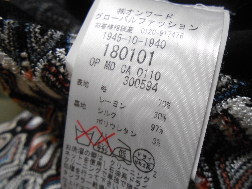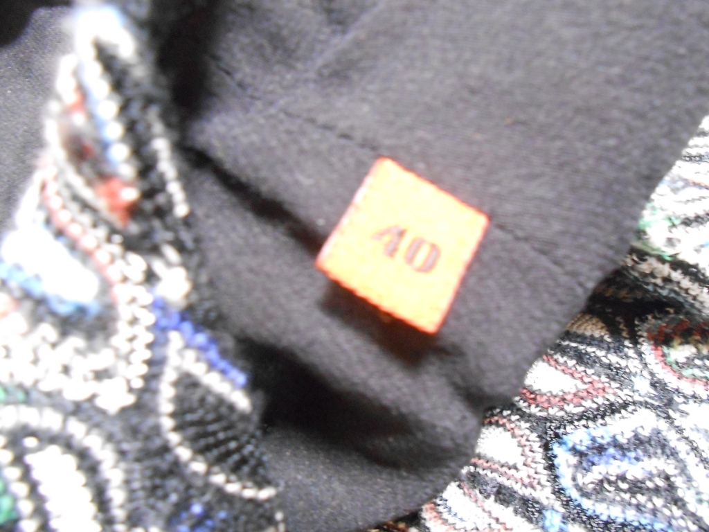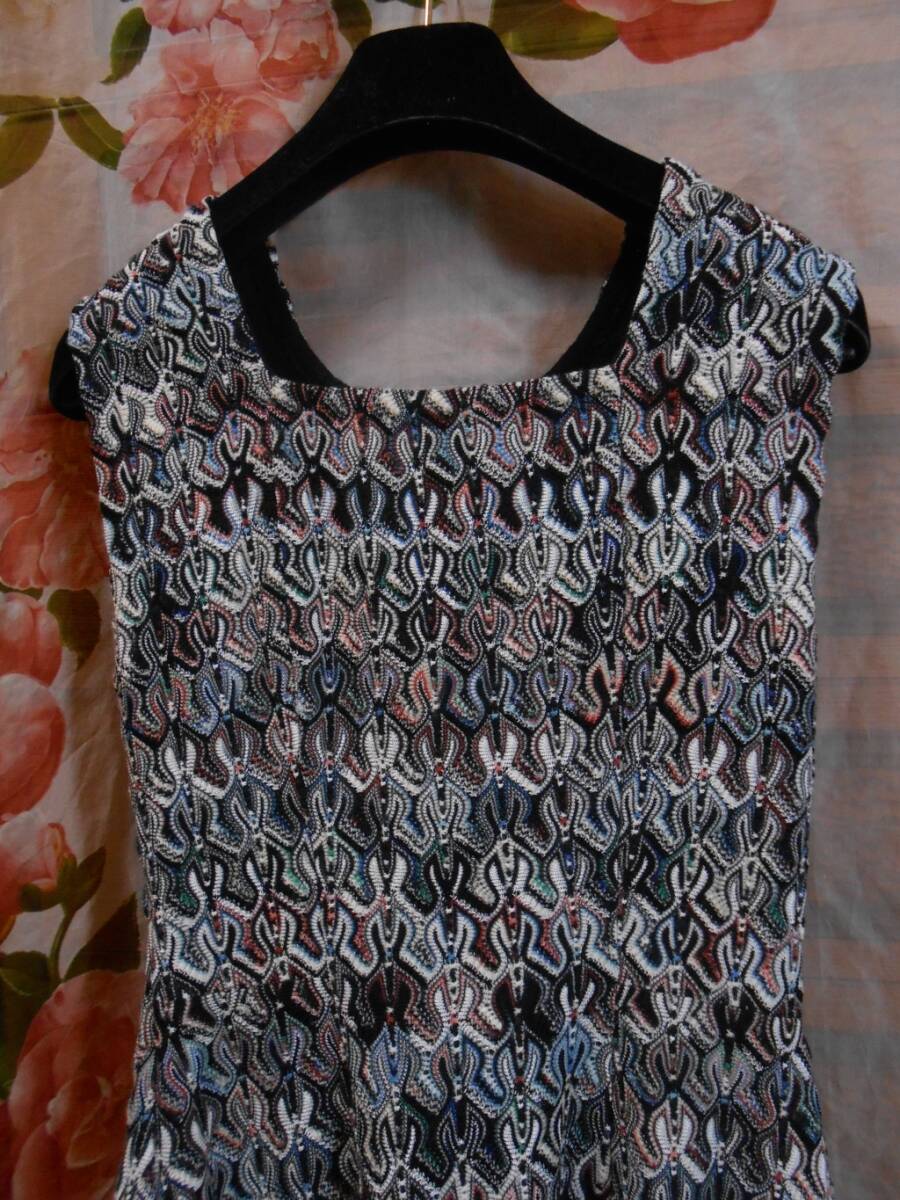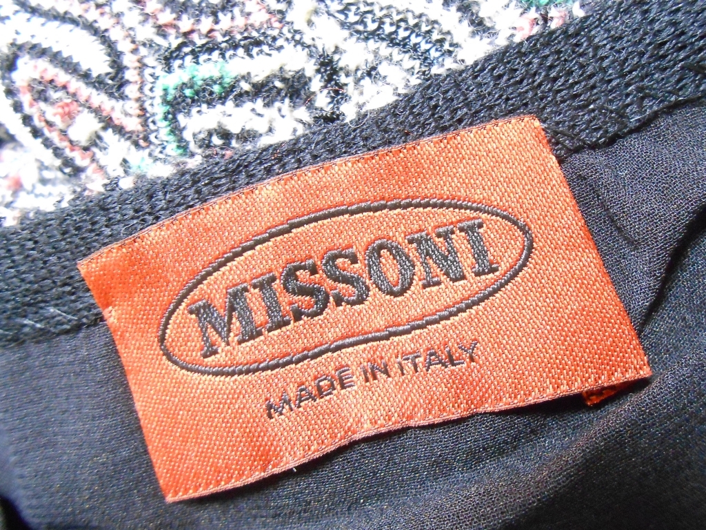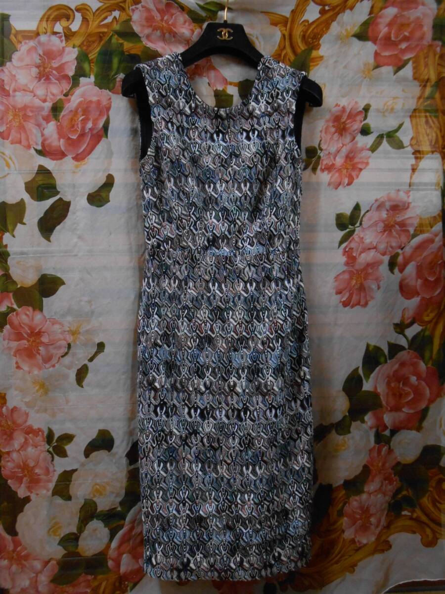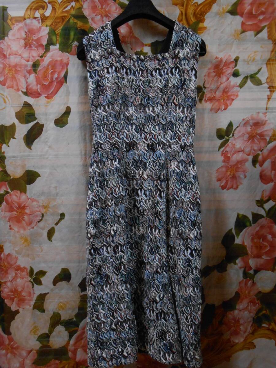 色彩のマジック、ミッソーニのノースリーブドレス。素材表記はウール70%、レーヨン30%。裏地はシルク97%、ポリウレタン3%。サイズ表記40。平置き採寸は肩の端から端まで37㌢、腕下身幅39㌢、着丈は肩上から101㌢。マルチカラーのミッソーニ柄編み。裏地はブラックカラーのジョーゼット。左脇下に着脱補助ジップ。イタリア製、オンワードグローバルファッション輸入品。参考価格25万円。美品認識を超安。