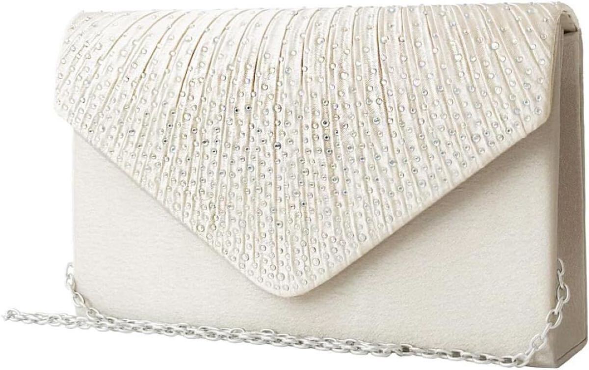 シワデザインを採用し、サテン生地にダイヤモンドを飾り付け、贅沢でキラキラな雰囲気を出させています、取り外し可能なチェーン付きで、マグネ留め具を採用していて、開閉便利です