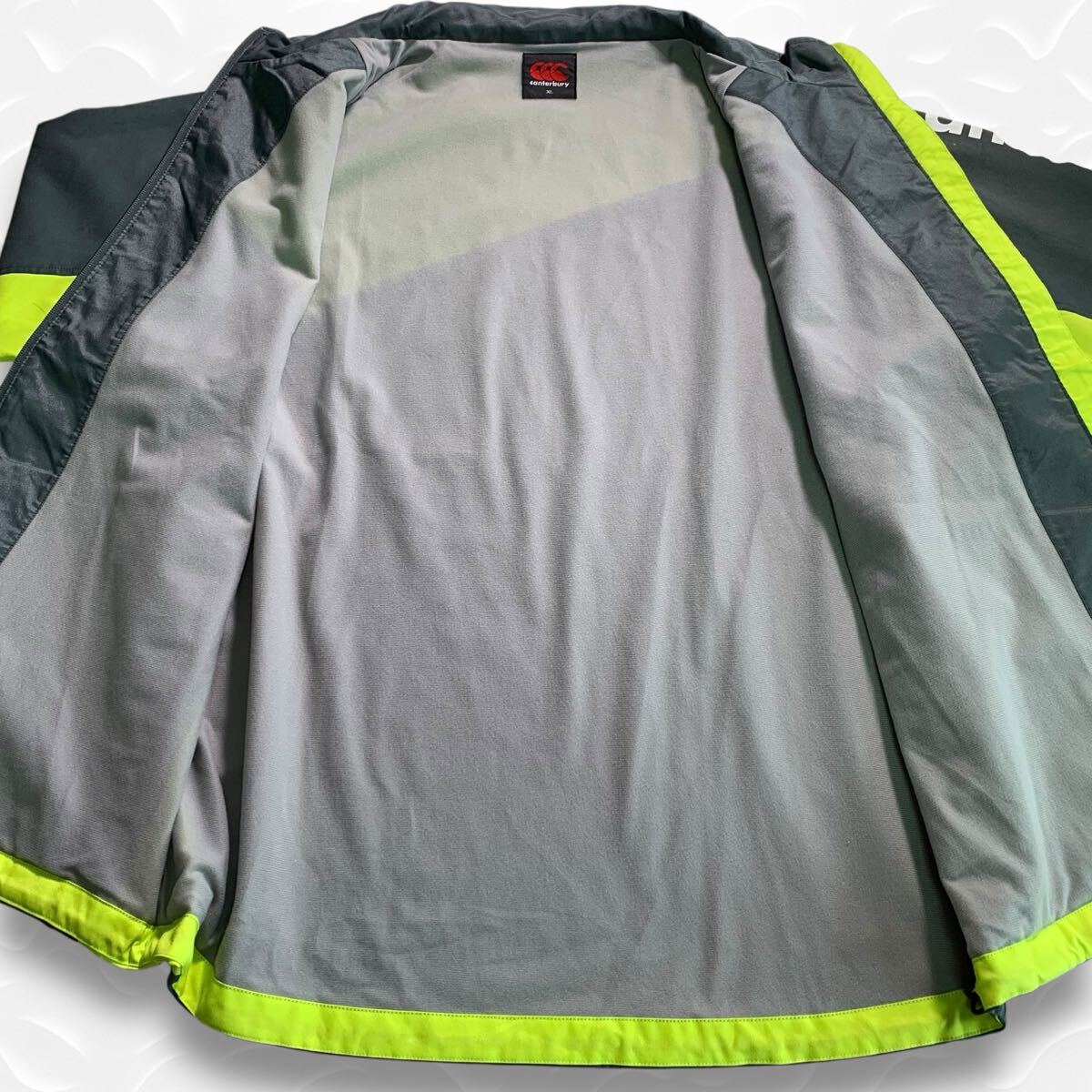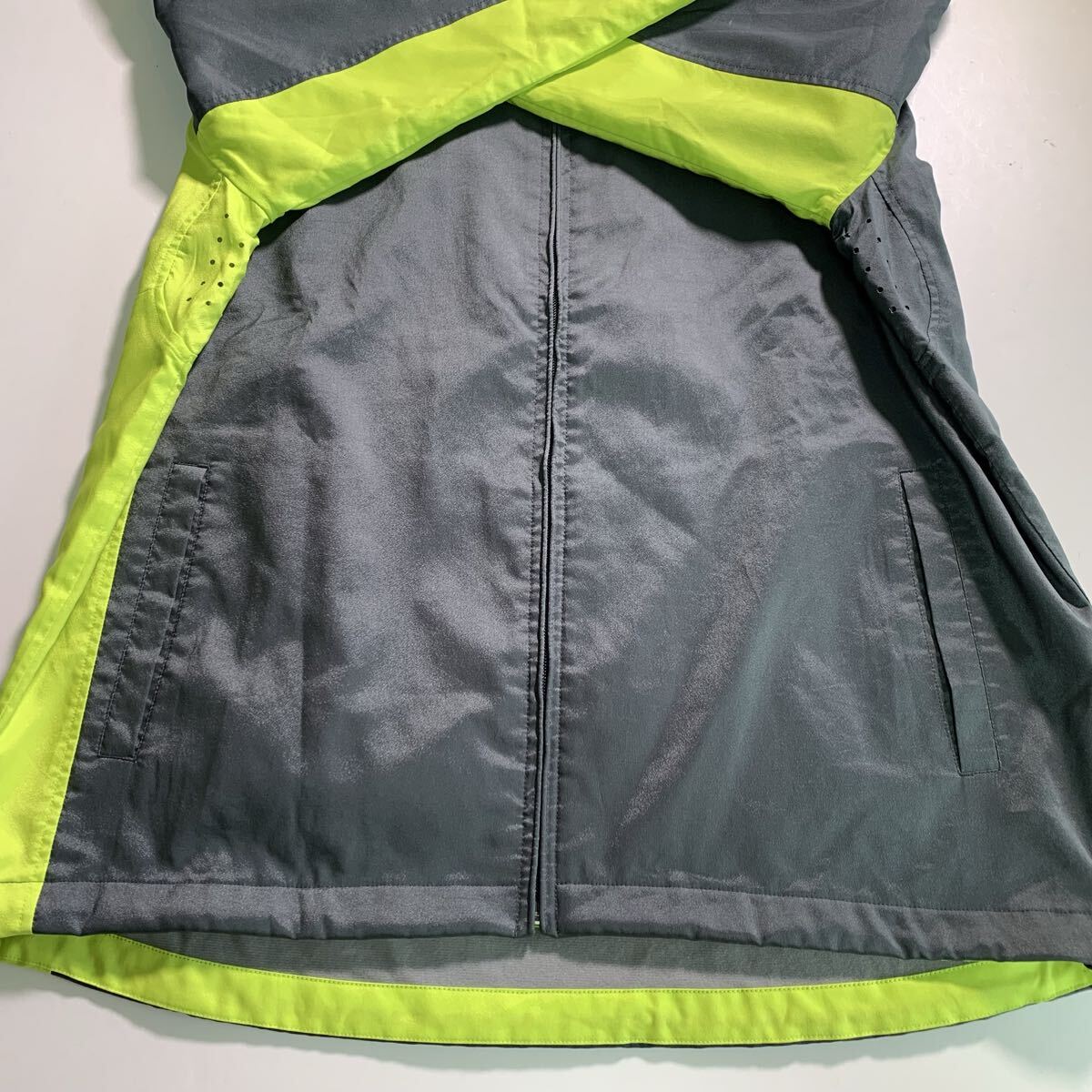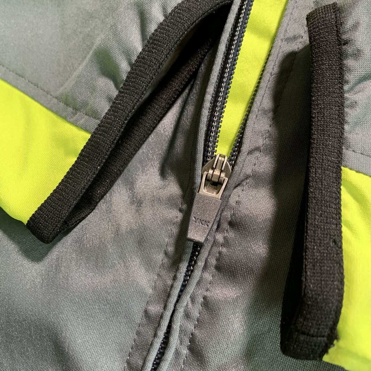 グレーとネオンイエローのジップアップウォームアップウェア、裏地はフリースで快適。