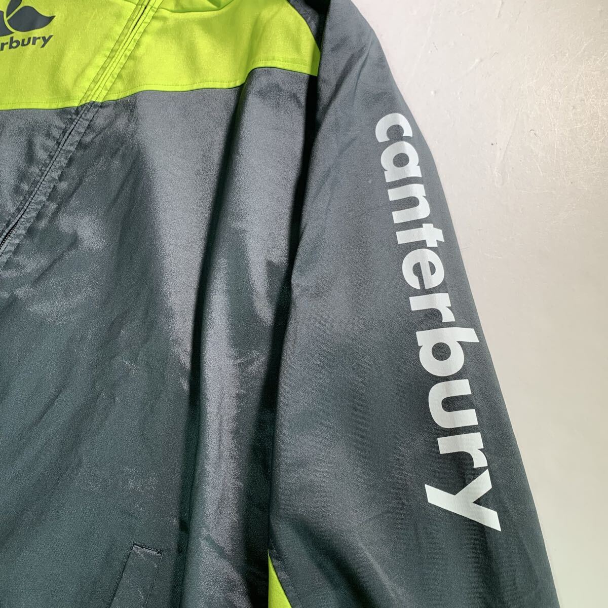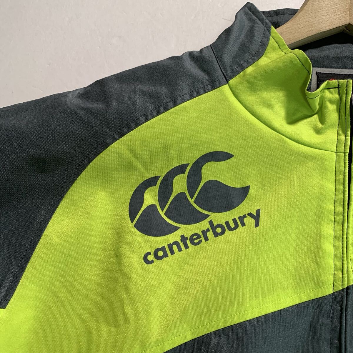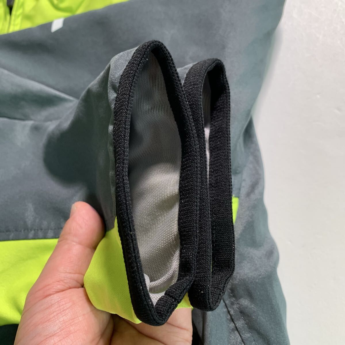 グレーとネオンイエローのジップアップウォームアップウェア、裏地はフリースで快適。