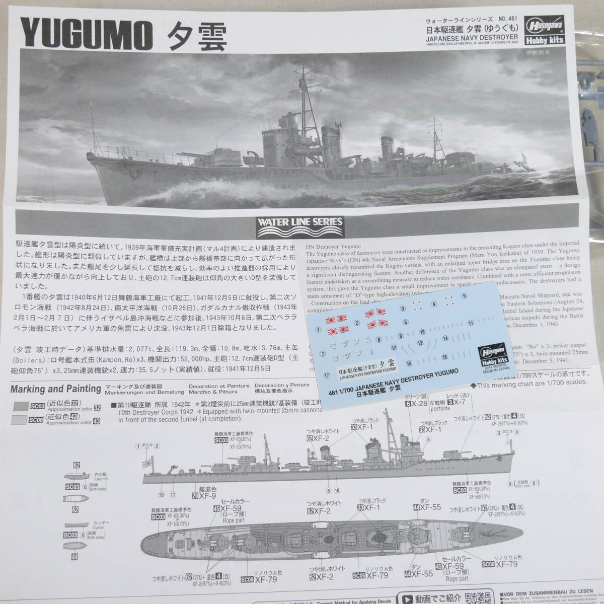 (19A19) 日本駆逐艦 夕雲(ゆうぐも) ハセガワ 1/700 ウォーターラインシリーズ NO.461 内袋未開封 未組立て