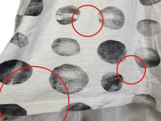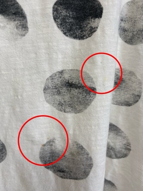 【状態】保管に伴うシワがあります。 毛羽立ちなど使用感がございます。 前身頃に写真のようなシミ・変色が点在しております。 後身頃の肩付近に凹みがございます。