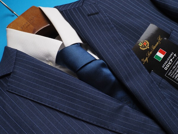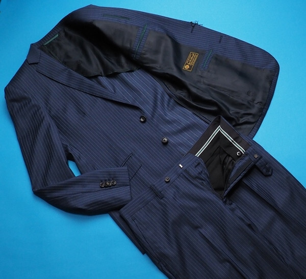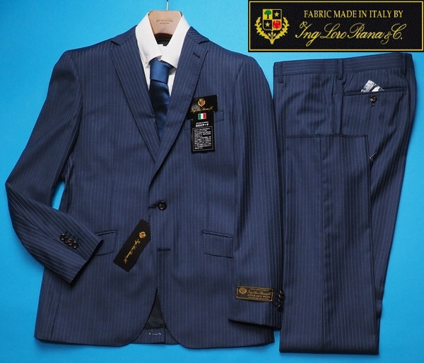 新品12.9万円 大手百貨店扱い 春夏『ロロピアーナ 伊製生地』Super130Sウール100% 艶感 ストライプ ツーパンツ スーツA4青(F) 1511672