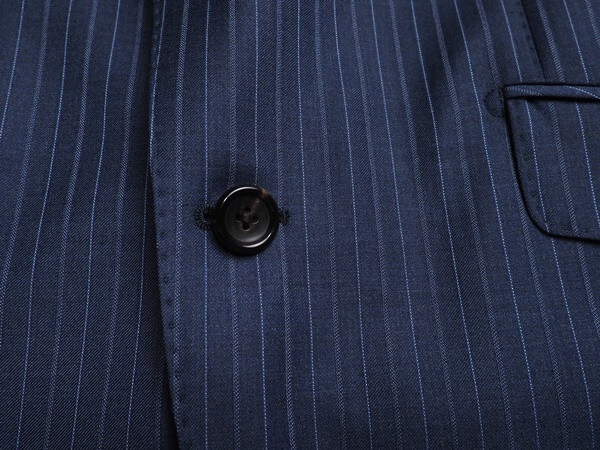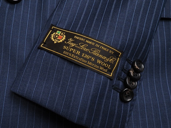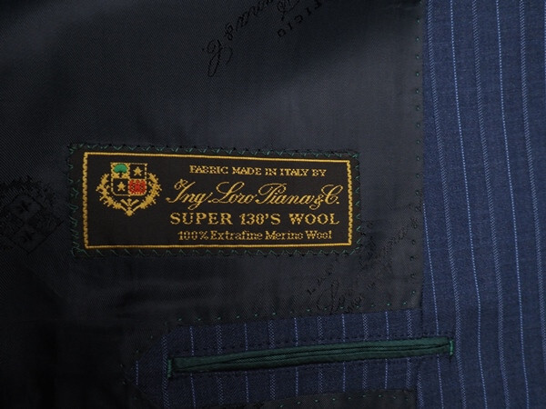 水牛釦、本切羽、AMFステッチ、ロロピアーナジャガード裏地、お台場仕立てなど、百貨店向けならではのオーダーメイド並みの最上級仕立てで仕上げられております。ファブリックはイタリアの最高級ファブリックメーカー、ロロピアーナ社のウール100%生地を使用。最高級オーストラリア産メリノウールSUPER130's生地を贅沢に使用。このメリノウールの繊維は非常に細く、1キログラムの羊毛から100キロメートルの長さを紡ぐ事が出来るそうです。その糸を1/2のサージの織機で織り上げることで、原毛の持つシルクのような上品な光沢を醸しだしています。