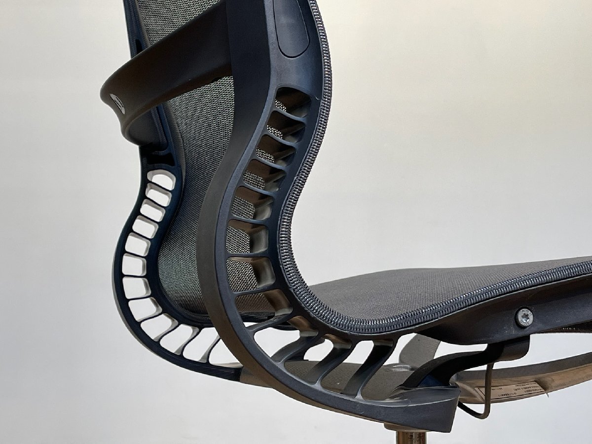 削り取られた煩雑な機能や操作性により実現した軽量さと共に、高機能デスクチェアとしては唯一無二、背もたれと座面を一体とした設計で、驚くほど快適な座り心地を実現しており、それを可能とした「キネマチックスパイン」というバネ状の構造体は、デザインによる優れた問題解決例として不動のリーディングケースとなっています。