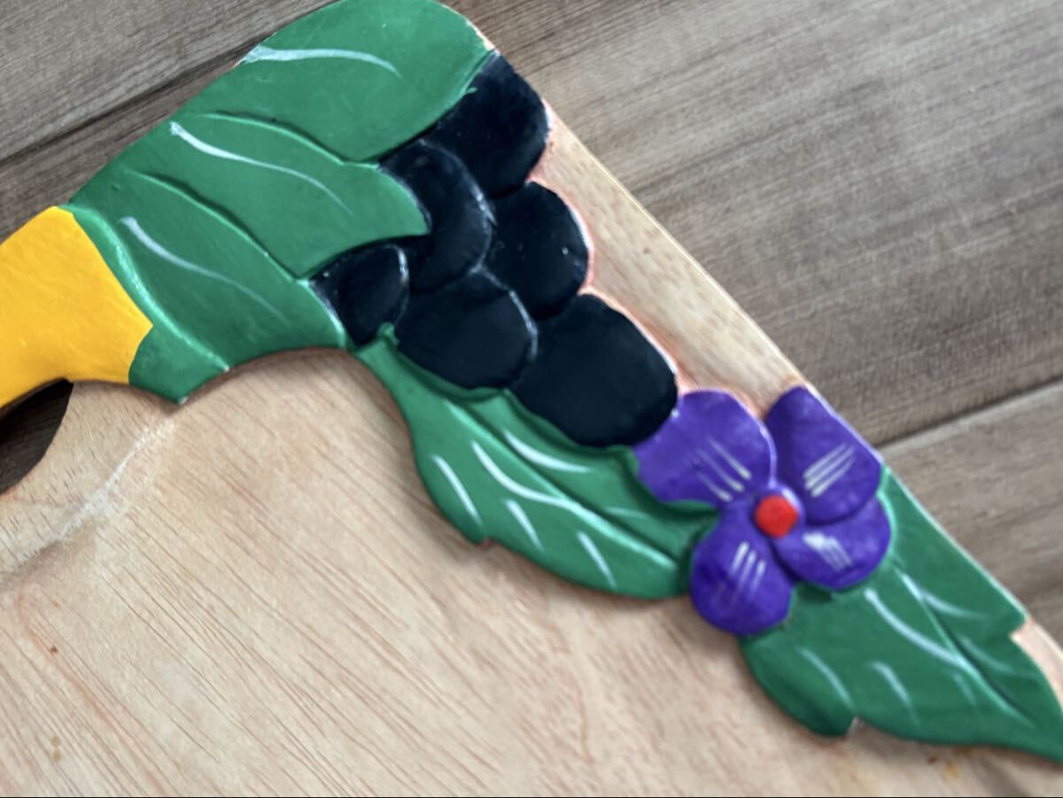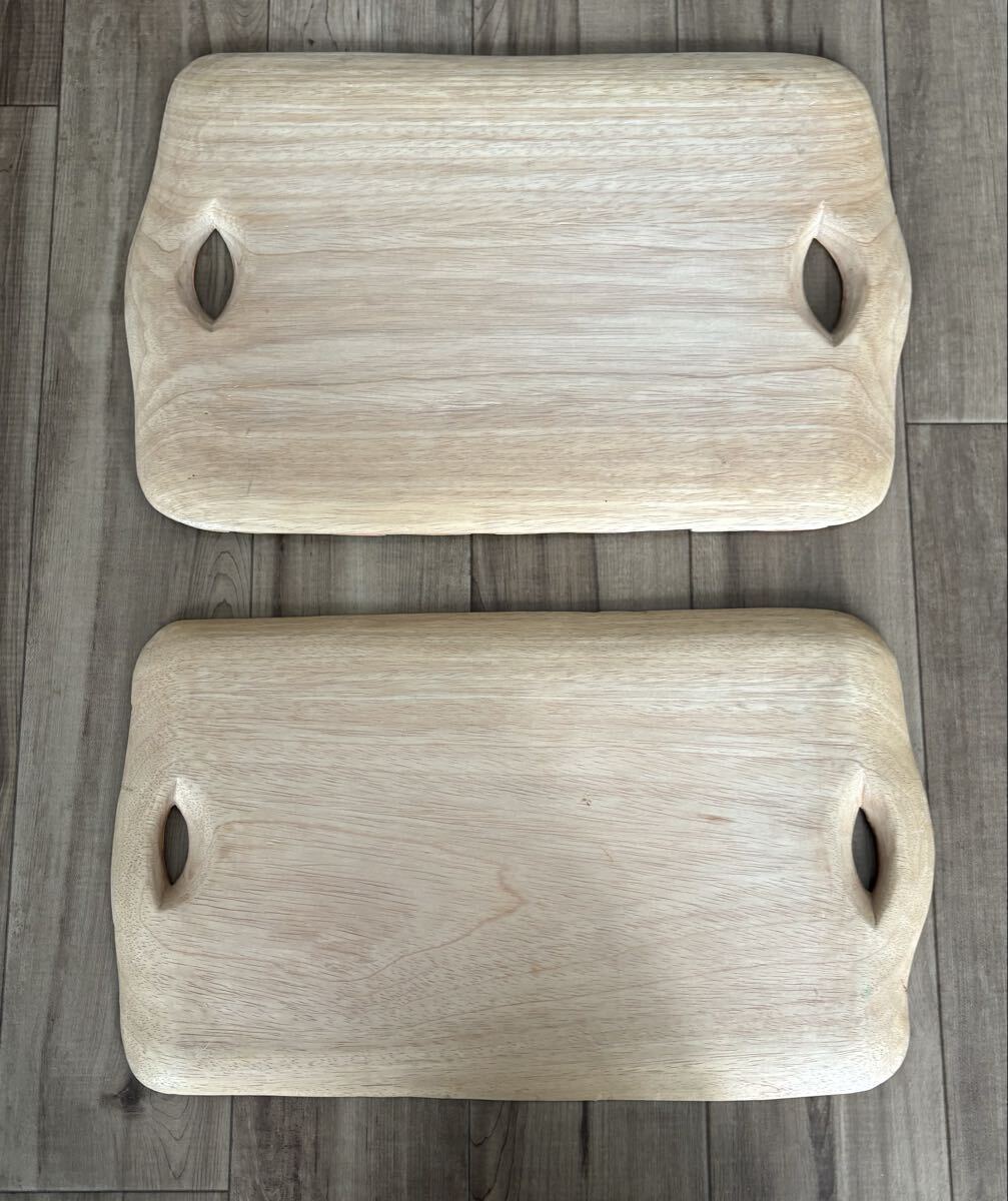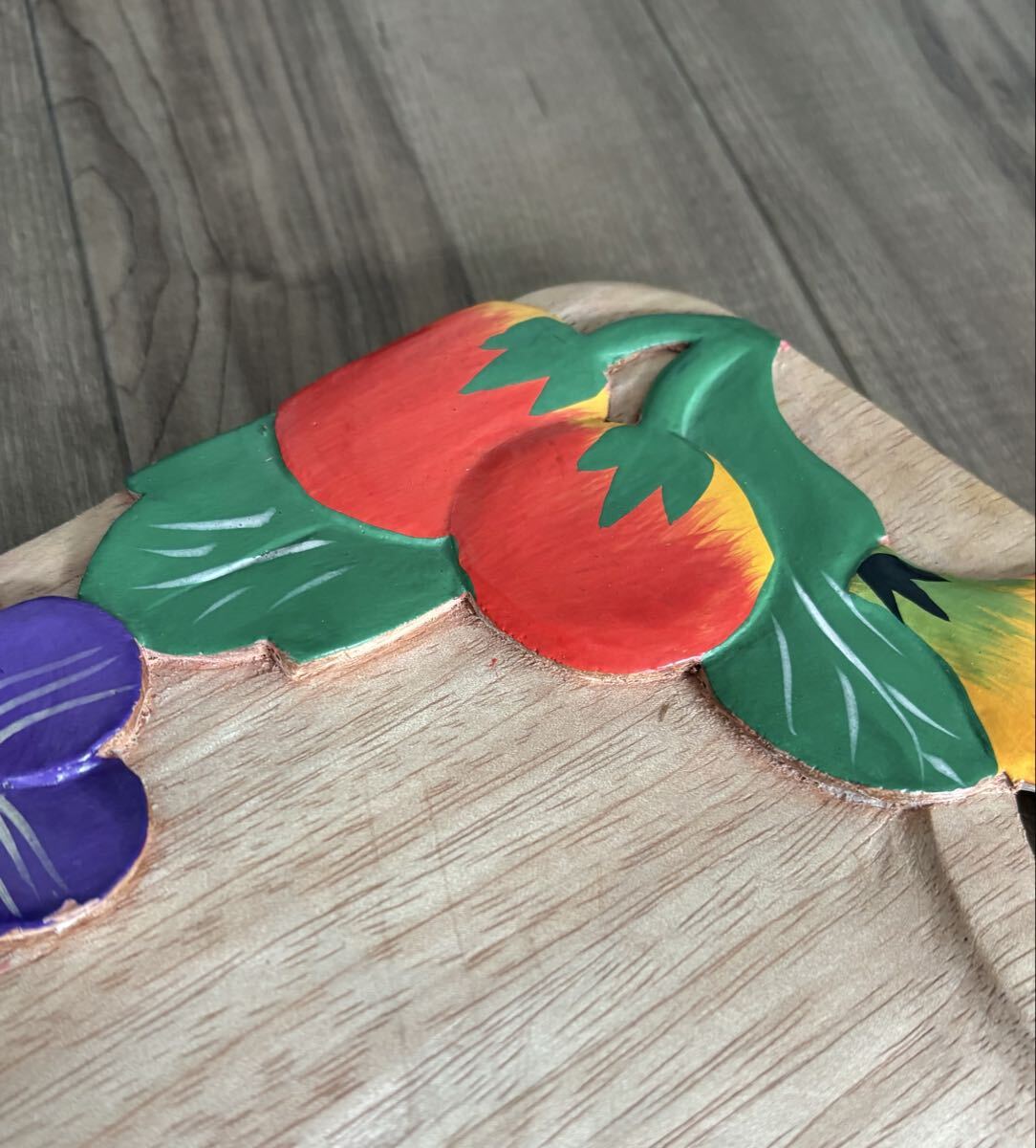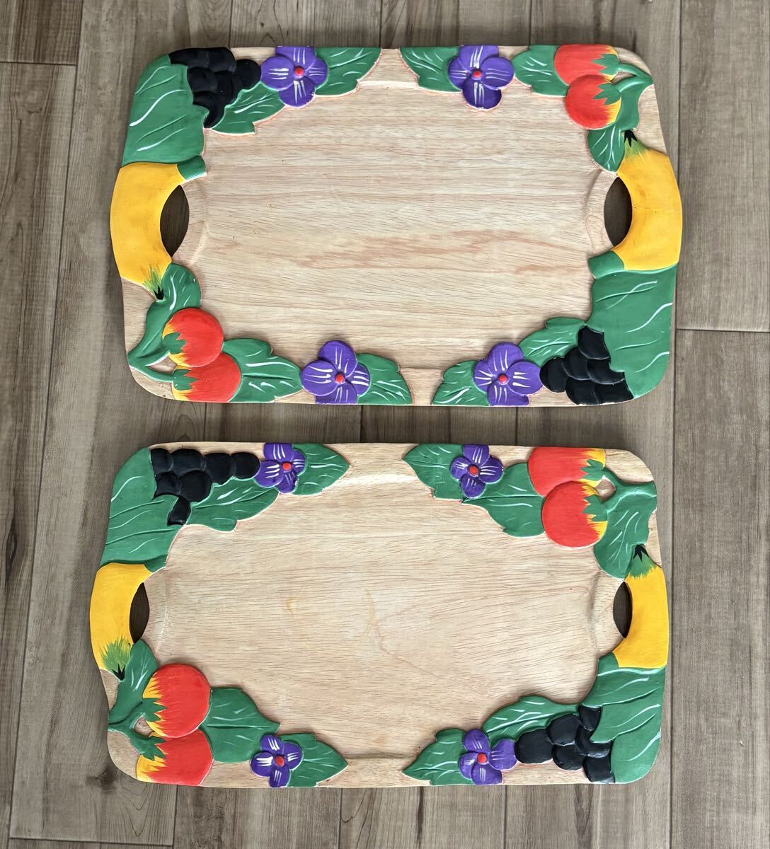 温もりのある木彫りに、カラフルなフルーツや花が美しくハンドペイントされた木製カービングトレイ2枚セットです。しっかりとした作りで、取っ手部分も使いやすく、ティータイムのお供やおしゃれなインテリアにも最適です。昭和レトロな雰囲気に惹かれる方、アンティークやレトロ雑貨収集がお好きな方におすすめします。全体的に中古美品といえるコンディションです(画像でご確認ください)。現在ではなかなか手に入らないデザインですので、ぜひこの機会にご検討ください。」
