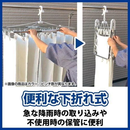物干し竿にかけた状態で、下方向に折りたためるので、急な雨の取り込み時も作業性が良く、未使用時の保管にも便利です。