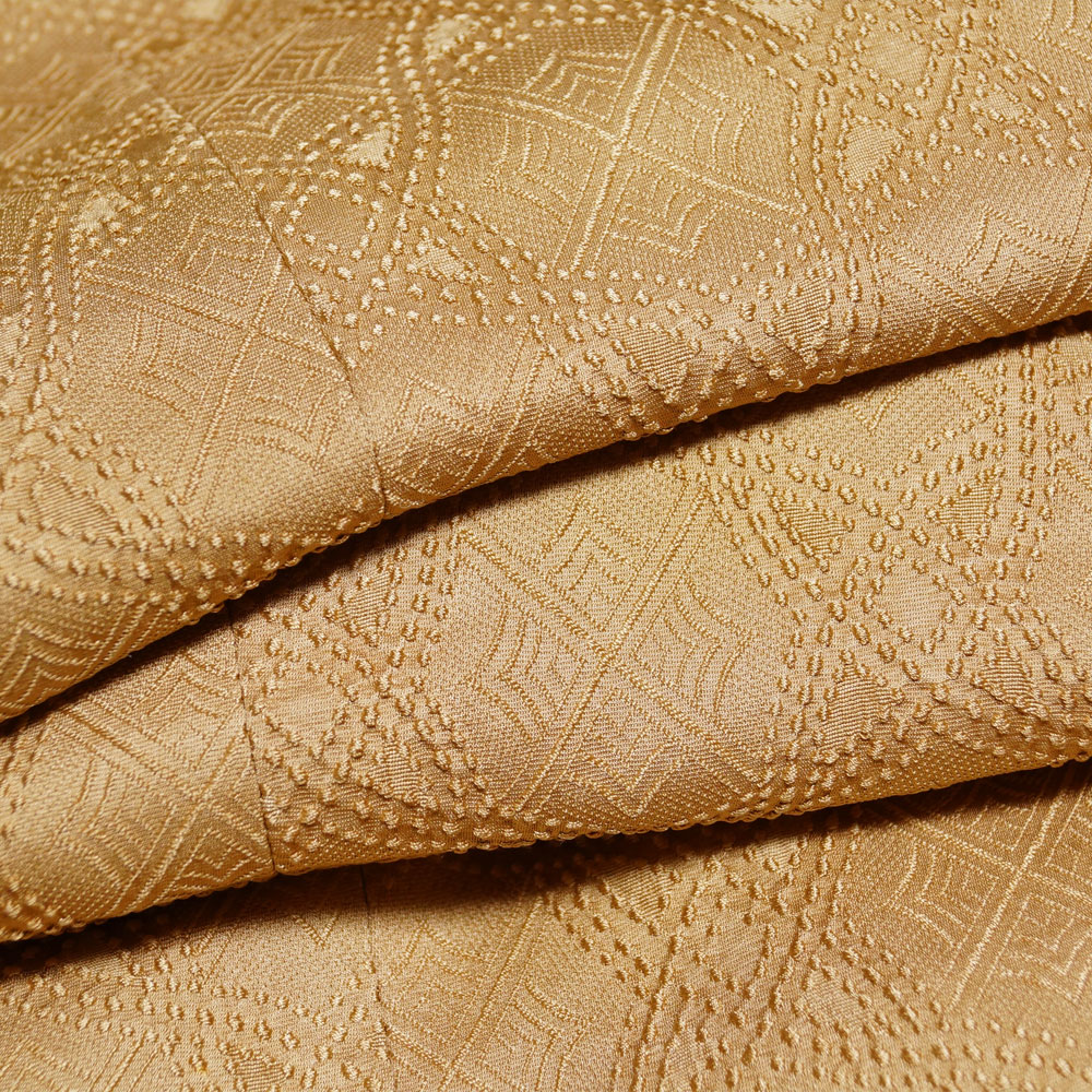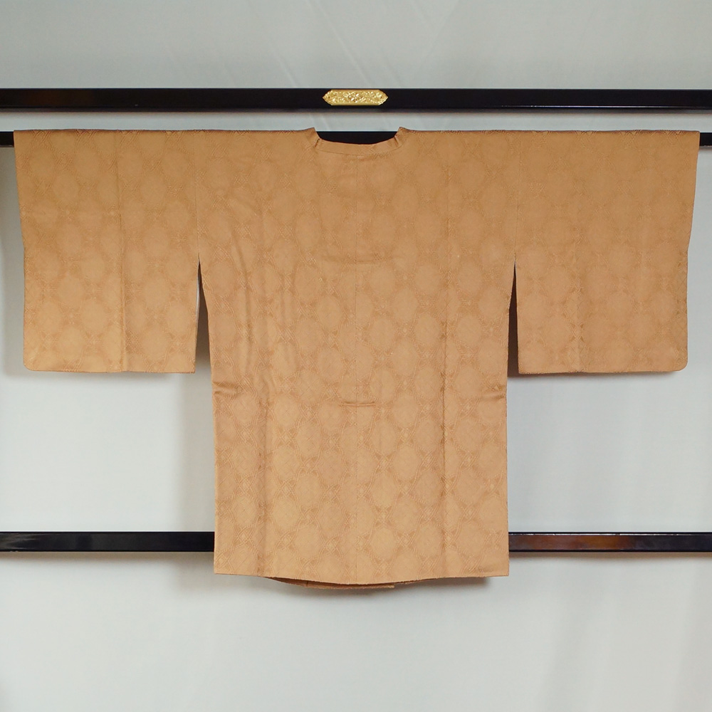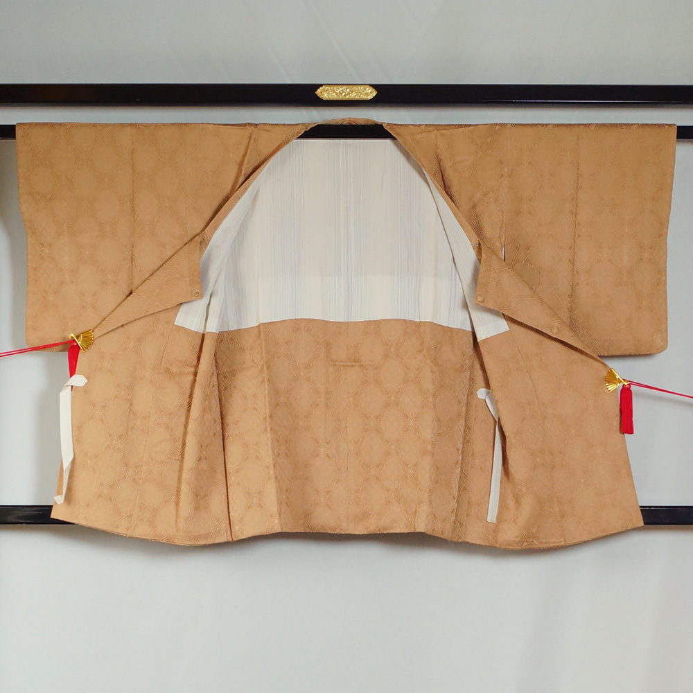 | 商品 説明 | 白茶色系の地に七宝や格子などの模様が地織された道行コートです。羽裏は縞模様が染められております。 |