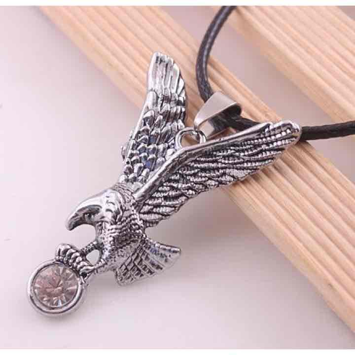格好良い鷹のトップペンダント、ストーンがキラキラでクールでワイルドなチョーカーです。革ひも付きなのでよりワイルドな雰囲気です。お洒落の仕上げにこの鷹のチョーカーをつけるとワイルドな魅力で完璧です。