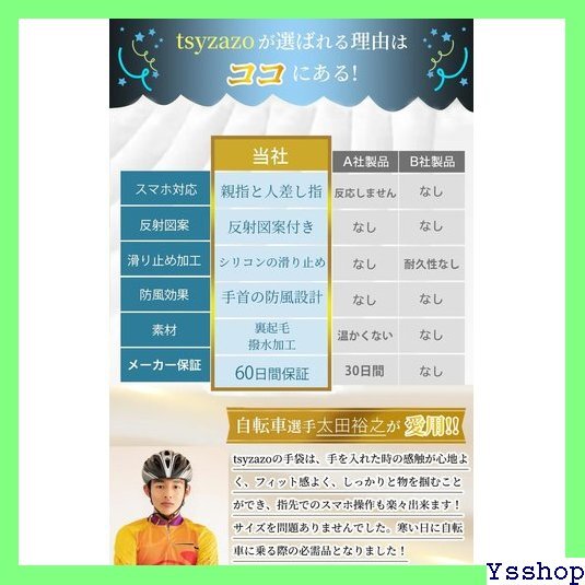 補足説明 : 自転車選手が愛用 防寒手袋 ランニンググローブ 自転車手袋 スマホ タッチパネル対応 裏起毛 滑り止め 撥水加工 バイク スポーツ アウトドア 登山 通勤通学 春秋冬用 メンズ レディース 19 複数店舗で販売させて 頂いておりますため、 売り切れ次第終了となります。 商品内容 : ブランド tsyzazo サイズ フリーサイズ 対象年齢 成年 色 ブラック 手の向き 左右兼用 商品パッケージ数 1 この商品について 【自転車選手が愛用の防寒手袋】tsyzazoの手袋は、手を入れた時の感触が心地よく、フィット感よく、しっかりと物を掴むことができ、指先でのスマホ操作も楽々出来ます!寒い日に自転車に乗る際の必需品となりました! 【中も裏起毛・手首の防風設計】手の温みで身体全体に冷えが来ない優れ物だ。指にフィットしブレーキ操作もしやすい!手袋の着脱時にも程よいフィット感でストレス無しです。 【タッチパネル対応・反射図案付き】親指と人差し指にスマホ操作ができる素材が使われている為片手持ちでも両手持ちでも操作ができ、とても便利です。反射図案なので、ファションだけでなく、夜間走行の安全性を高めます。 【撥水加工・滑り止め加工】雨でも手が濡れることもなく、快適に使用することができました。(※ある程度の防水性、完全防水はできません)手の平と指先にシリコンの滑り止め加工がされているのでグリップ効果は強力、動きを邪魔することもありませんでした。 【フリーサイズ・男女兼用】様々なシーンで大活躍!自転車、車を運転、ランニング、スポーツ、通勤通学、アウトドア、作業、日常用など。 【自転車選手が愛用】防寒手袋 ランニンググローブ 自転車手袋 スマホ タッチパネル対応 裏起毛 滑り止め 撥水加工 バイク スポーツ アウトドア 登山 通勤通学 春秋冬用 メンズ レディース ブランド など : / / tsyzazo 梱包にも注意して お届け致します。 土日祝に関して、 配送業者が お休みであるため、 土日祝前のご注文は 出荷が遅れる 可能性があります。 ご理解の上 ご購入下さいませ。 いつまでも ありがとうございます。