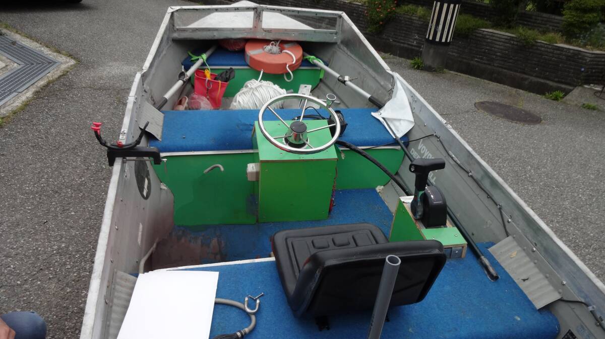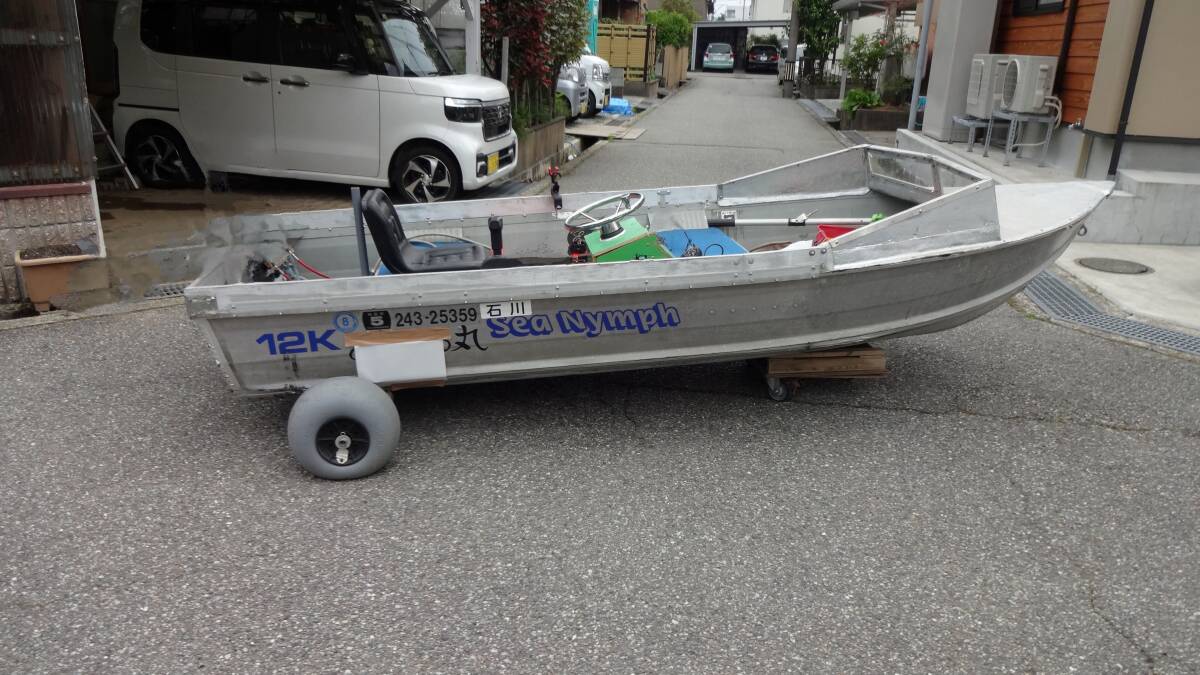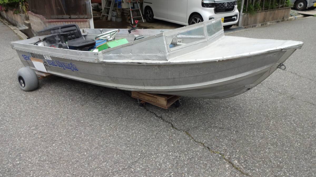 12フィートアルミ船中古です。船検は令和8年7月26日まで検査あります。オール2本、ビルジポンプ2個、ビルジポンプ用自動フロートスイッチ1個、ハンドル、ステアリングケーブル、リモコン、リモコンケ-ブル 2本ついています。エンジン、法廷備品、燃料タンク、燃料ホース、GPS 魚探、は付いていません。引き取りでお願いします。また、配送手配できる方でお願いします。