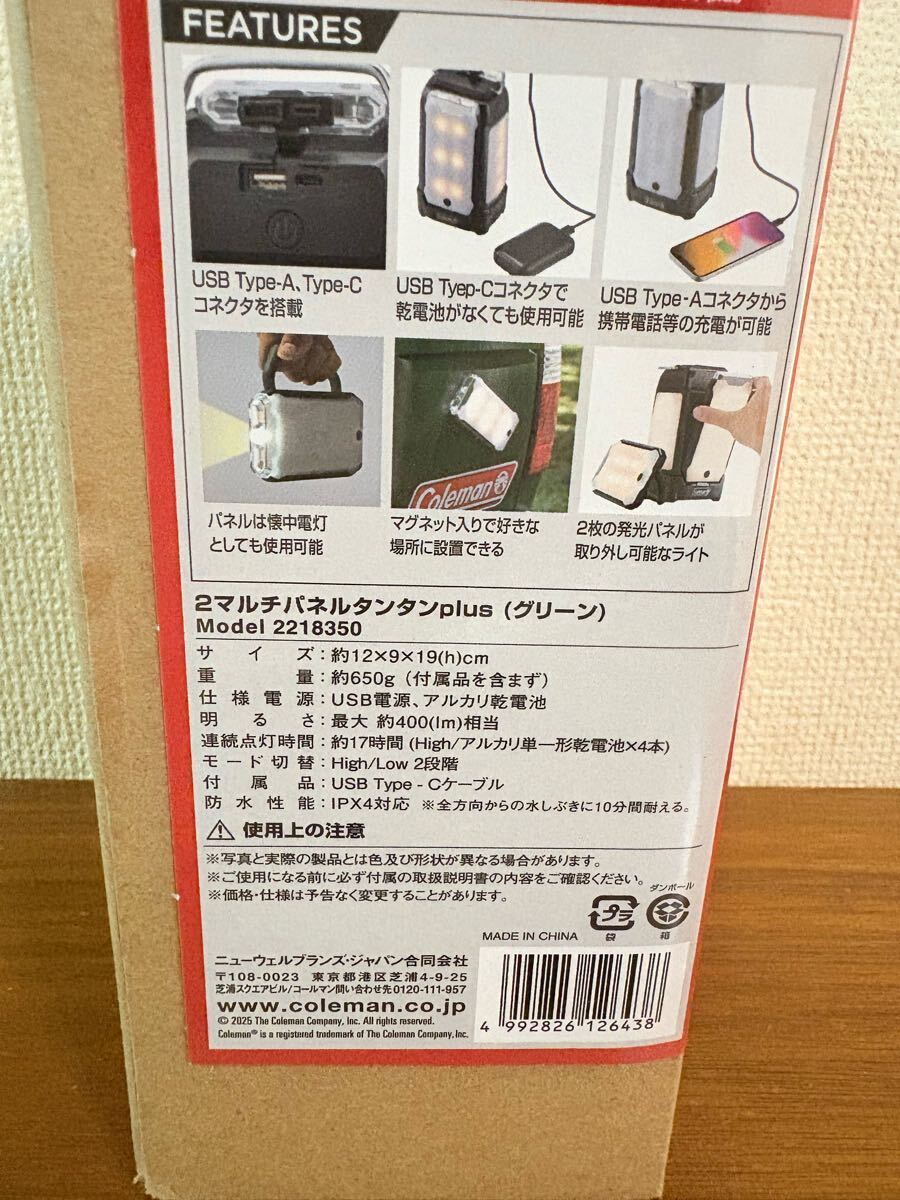 2枚の発光パネルが取り外しできるライト。乾電池(別売)、USB電源の2WAY仕様■明るさ:最大約400ルーメン相当■使用電源:USB電源、アルカリ乾電池(別売)■連続点灯時間:約17時間(High/アルカリ単一乾電池×4本時) ■充電時間:約5時間(パネルライト充電) ■モード切替:High/Low 2段階 ■防水性能:IPX4対応※全方向からの水しぶきに10分間耐える。
