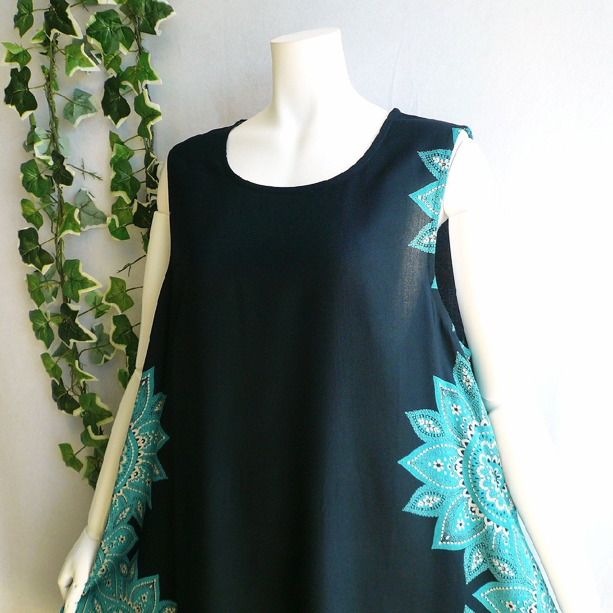 新品 9655 ML サイド花柄 レーヨン100% ワンピース 春 夏 黒 グリーン系 レディース Aラインフレア インド製 50代 60代 70代
