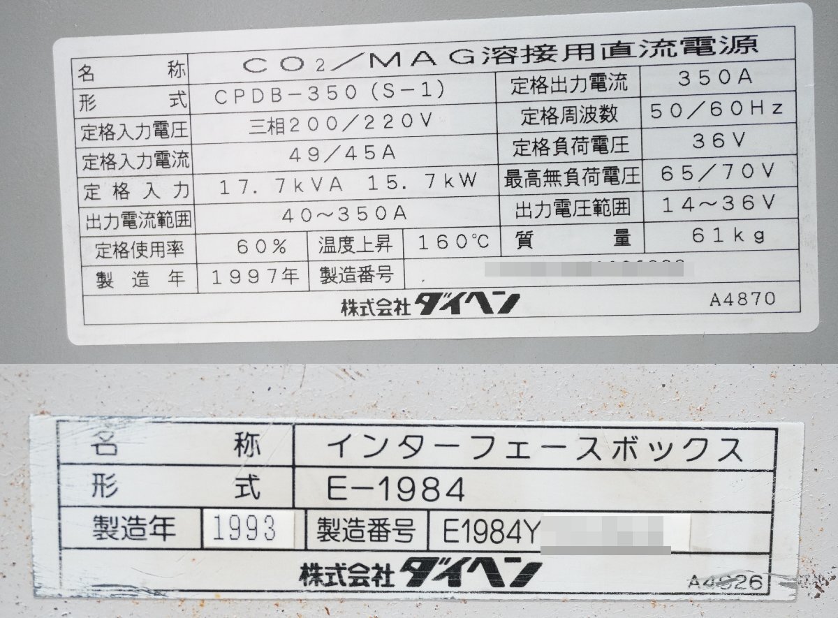 ■カテゴリー別のリンクはこちら■ →測定器・アマチュア無線 →工具・農業機械 →カメラ・映像機器 →オーディオ・楽器 →スポーツ・レジャー・自動車関連 →PC・周辺機器・ゲーム →ミシン・店舗用品・その他 ※便宜上、送料0円(送料無料)と表示されていますが、 実際の送料は無料ではなく、着払いになります。 落札後、住所確認致しましたら、送料のお見積りをお知らせいたします。 商品お受け取り時に配送業者にお支払いください。 ■商品説明■ ***************************** 全体サイズ: 約 57X50X84 (高)cm パレット込みサイズ: 約 77X70X99 (高)cm 三相200V 当方で備品のケーブルを使用して 短時間のテストをしたところ、 電源が入り、溶接ができました。 本商品に対して専門ではないために 細部に渡る細かなチェックはできておりません。 また、中古品としてご理解いただきジャンクとして ノークレーム・ノーリターンでお願い致します。 ■外観■ 状態については写真判断の程よろしくお願いいたします。 中古品ですのでキズ、汚れ、擦り傷、サビなどが有ります。 付属品に関しては、写真の物が全てです。 不足しているケーブルがあります。 ******************************** 台車やパレットを撮影用に使用している場合、付属しません。 バッテリー等の消耗品が付属する場合 どの程度消耗しているか不明ですので、保証は致しかねます。 ガソリンやオイルを使用している商品の場合は、 配送中の油漏れ防止のため 抜いて発送致しますので、ご了承ください。 ******************************* ノークレーム・ノーリターンでお願いいたします。 | ||||