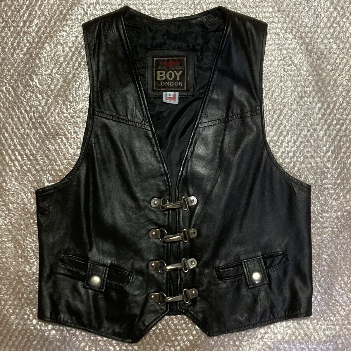 USA製 BOY LONDON バックル留めレザーベストです。 とても良好なコンディションです。 ▼サイズ(平置き ・表記:L ・着丈前/後:約61/56㎝ ・肩幅:約33cm ・身幅:約50㎝ ★免責事項 ・ネコポス/ゆうパケット(ポストmini/ポスト)/定形外/レターパックは 簡易包装になりますので動作保証や発送事故/紛失の保険や補償対象外です。