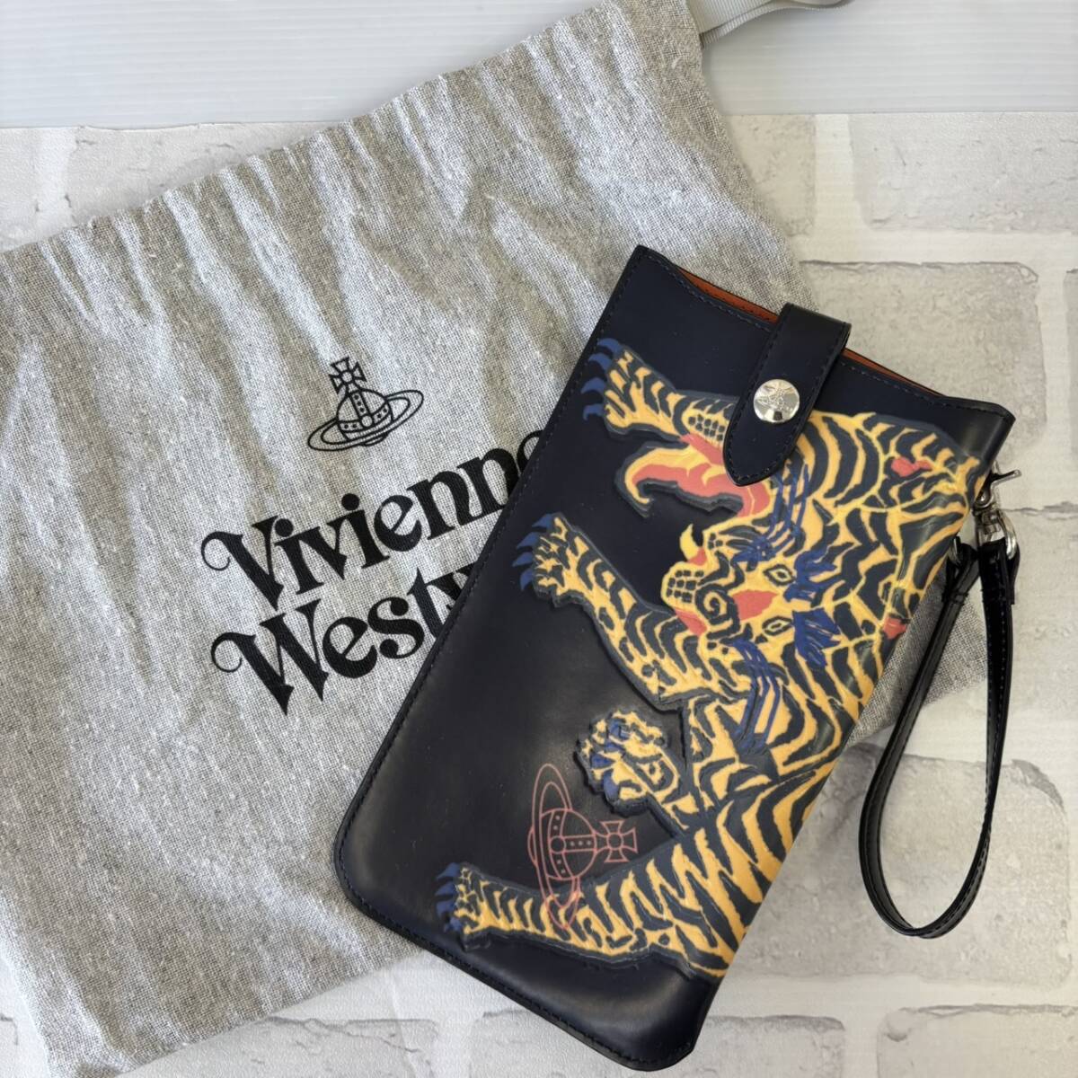 【TF0909?】Vivienne Westwood スマホケース スマホポーチ 虎? 黒 巾着付き