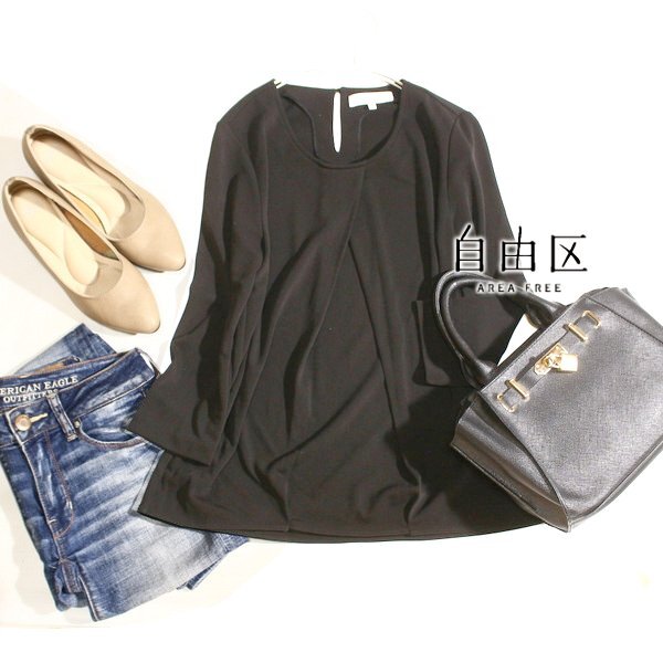 美品 オンワード樫山 自由区 綺麗め 細身 タック ストレッチ カットソー 38号 M 春 秋 25D08
