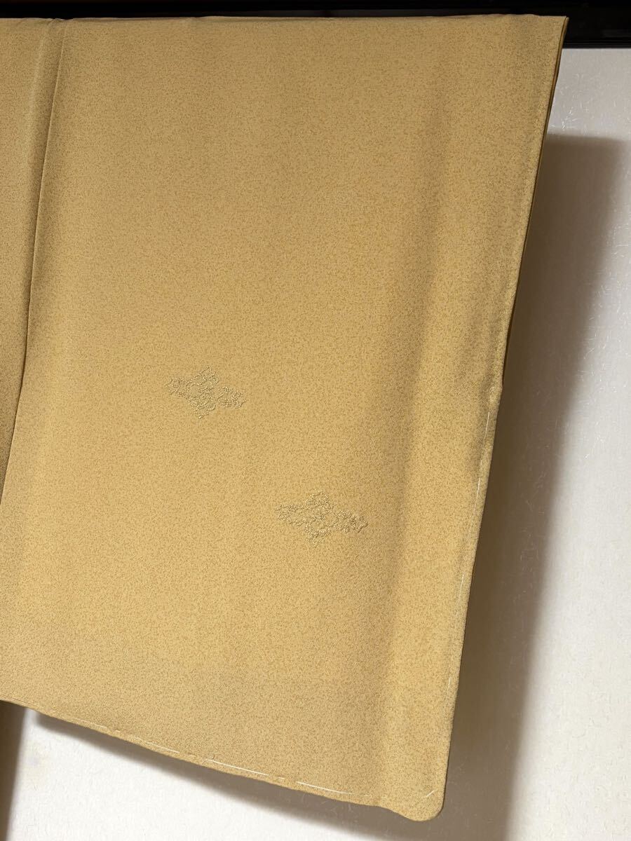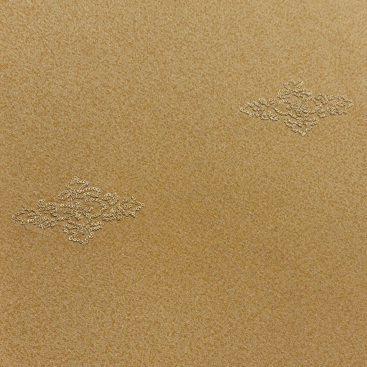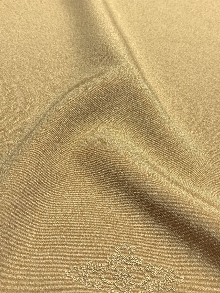 明るい辛子色が秋らしい雰囲気の訪問着。繊細な刺繍が映える上品なデザインです。