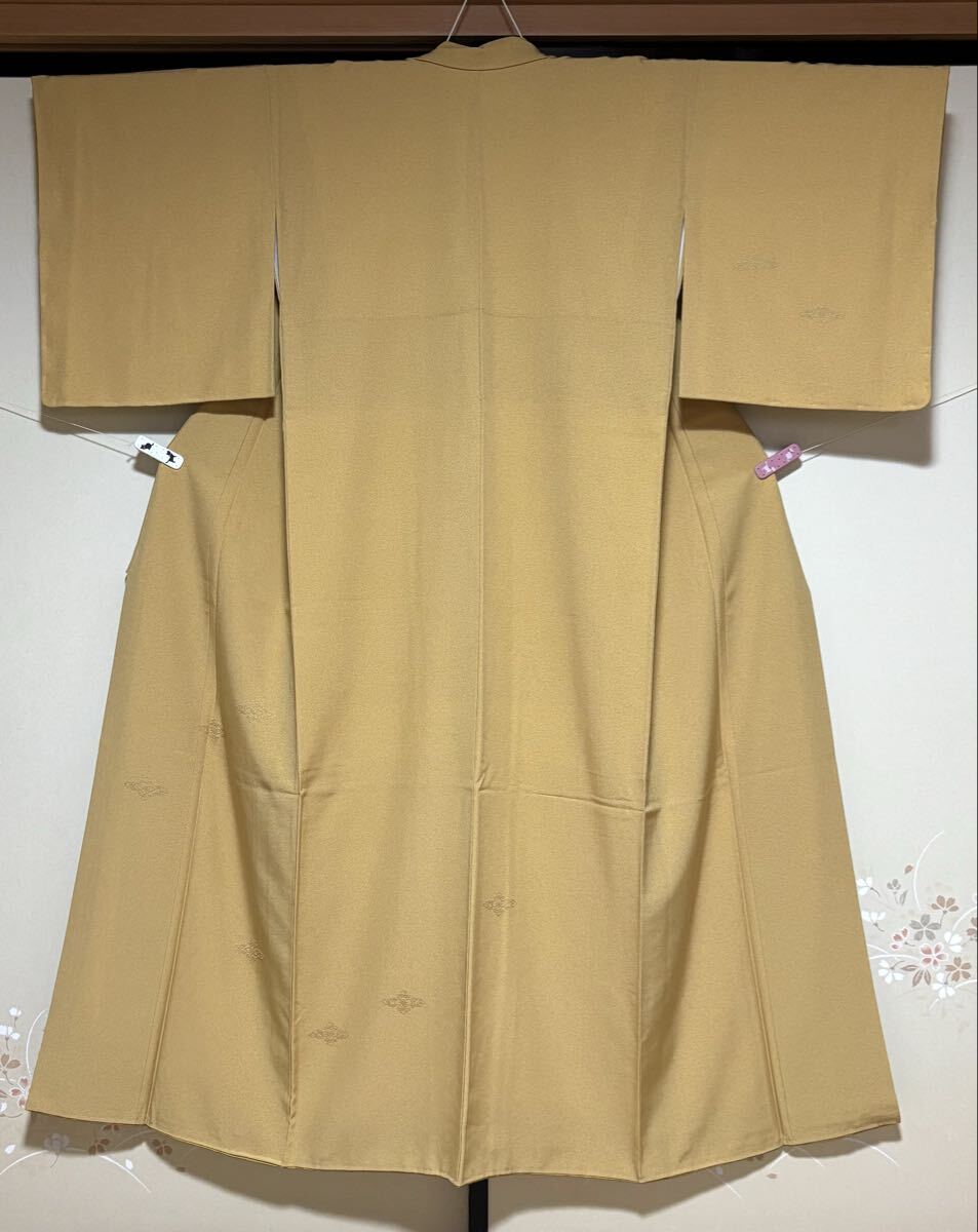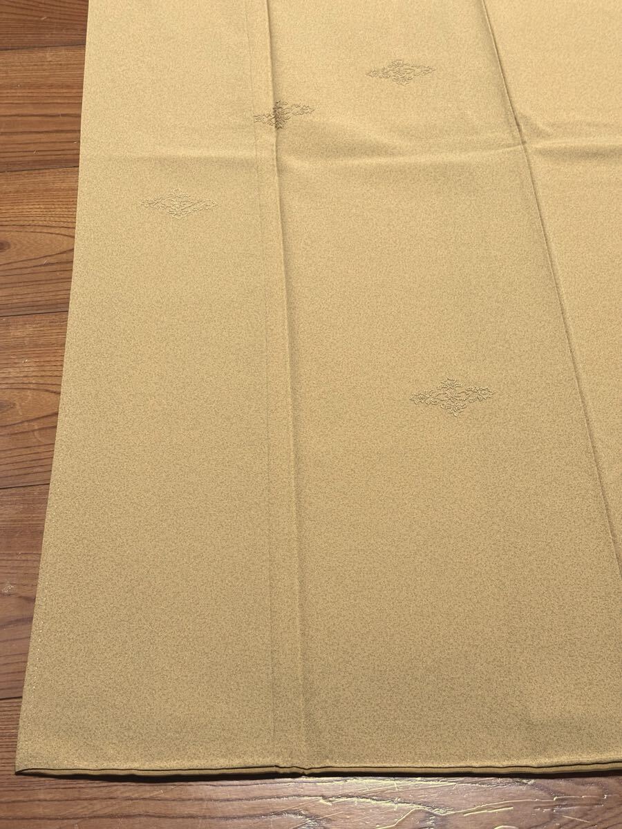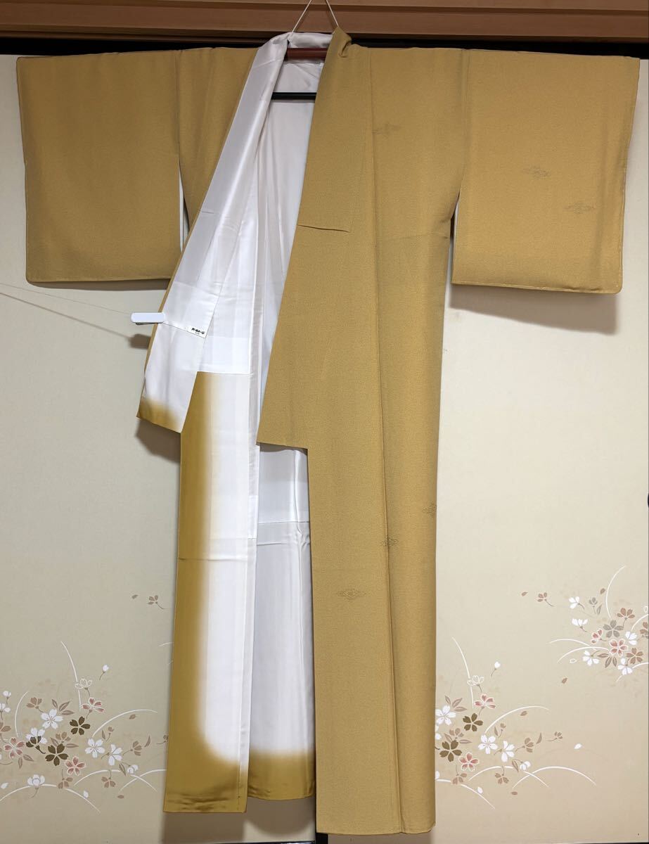 明るい辛子色が秋らしい雰囲気の訪問着。繊細な刺繍が映える上品なデザインです。
