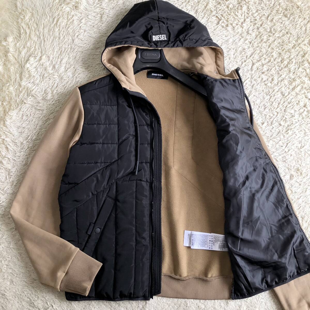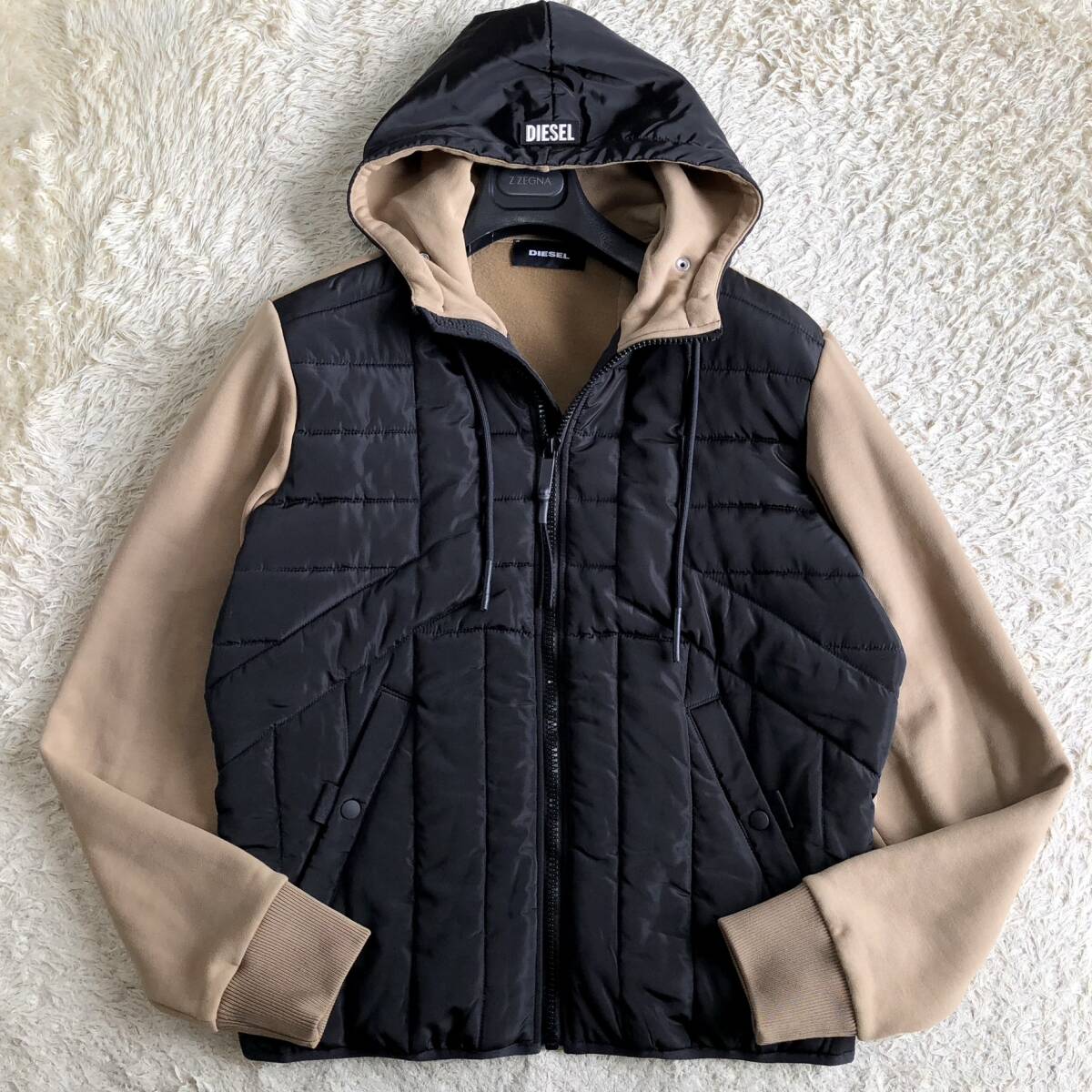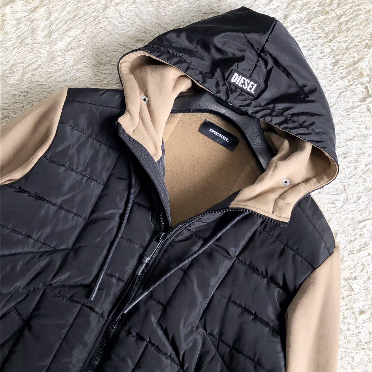 美品/XL相当●ディーゼル DIESEL キルティング 切替 裏起毛 フードロゴ コンビパーカー ジャケット ブルゾン フーディー ジップ メンズ