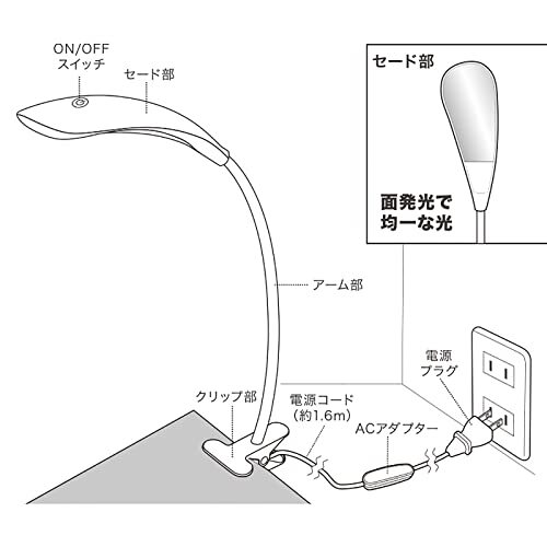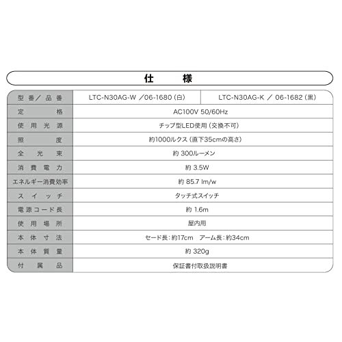 屋内省エネタッチ式・白 LTC-N30AG-W・・Color:白・角度調整自由自在、フレキシブルアームで立体的に広い範囲を照らす、LEDクリップライト・多重影を大幅に軽減し、やさしいあかりで目が疲れにくい・まぶしさや照射面の反射を軽減、学習や読書におすすめ・LED使用で省エネ(蛍光灯タイプと比較した場合)・本体カラーは白【 特 長 】 ● 角度調整自由自在、フレキシブルアームで立体的に広い範囲を照らす、LEDクリップライト ● 多重影を大幅に軽減し、やさしいあかりで目が疲れにくい ● まぶしさや照射面の反射を軽減、学習や読書におすすめ ● LED使用で省エネ(蛍光灯タイプと比較した場合) ● 本体カラーは白 【 仕 様 】 ■ 定格:AC100V 50/60Hz ■ 消費電力:約3.5W ■ 全光束:約300ルーメン ■ エネルギー消費効率:約85.7lm/w ■ 照度(最大):約1000ルクス(直下35cmの高さ) ■ スイッチ:タッチ式スイッチ ■ 使用光源:チップ型LED使用(交換不可) ■ 電源コード長:約1.6m ■ 使用場所:屋内用 ■ 本体寸法:セード長 約17cm、アーム長 約34cm ■ 本体質量:約320g ■ 付属品:書付取扱説明書