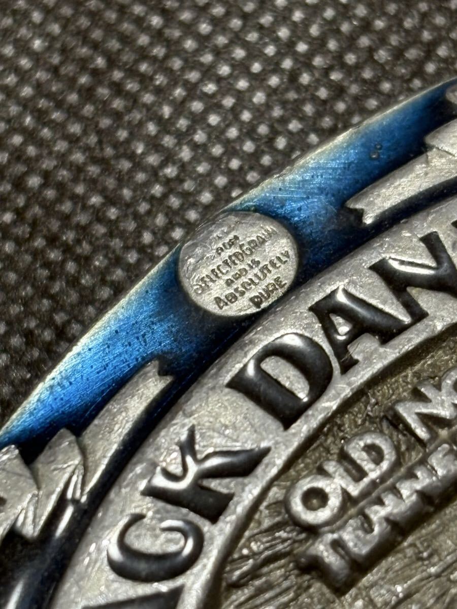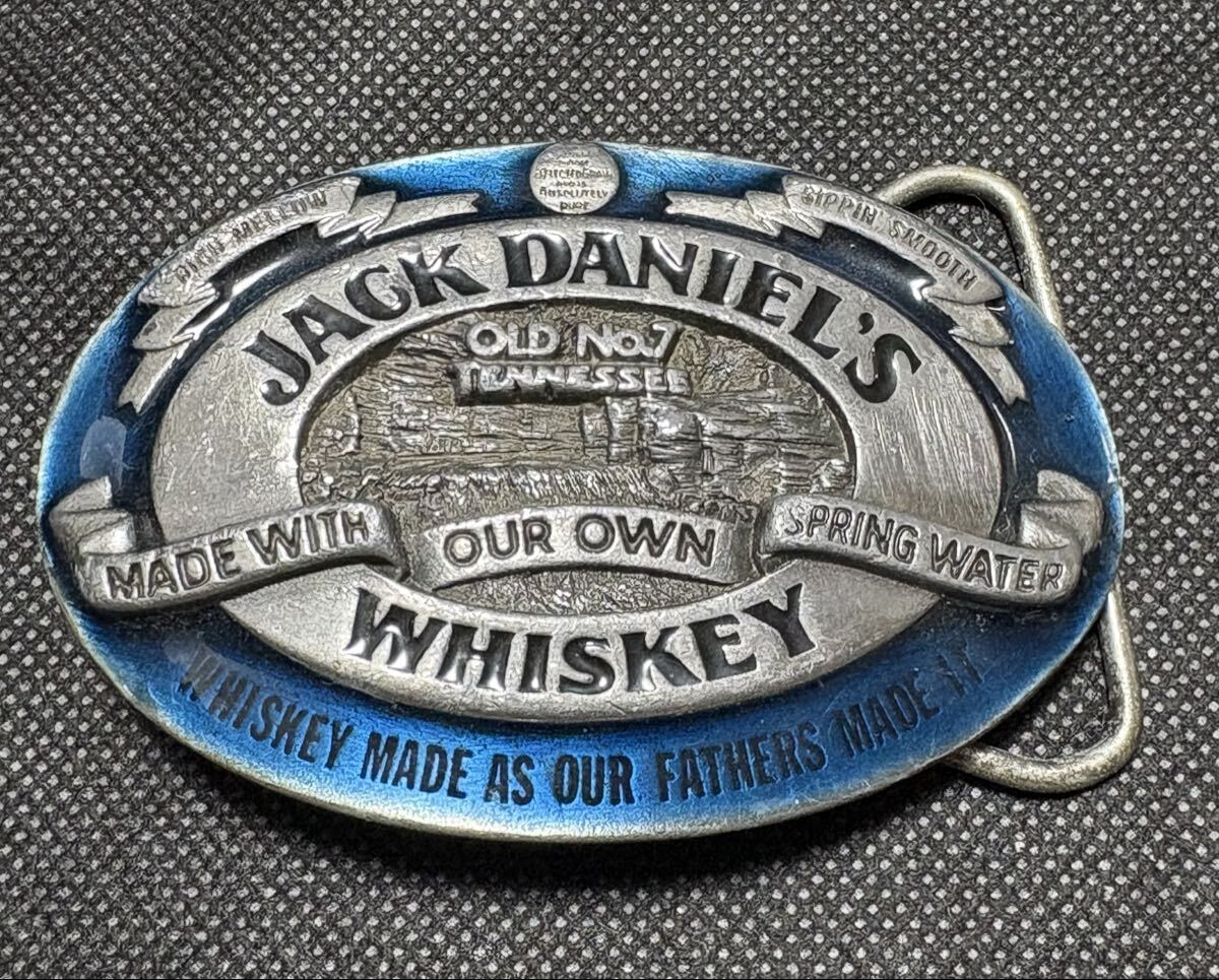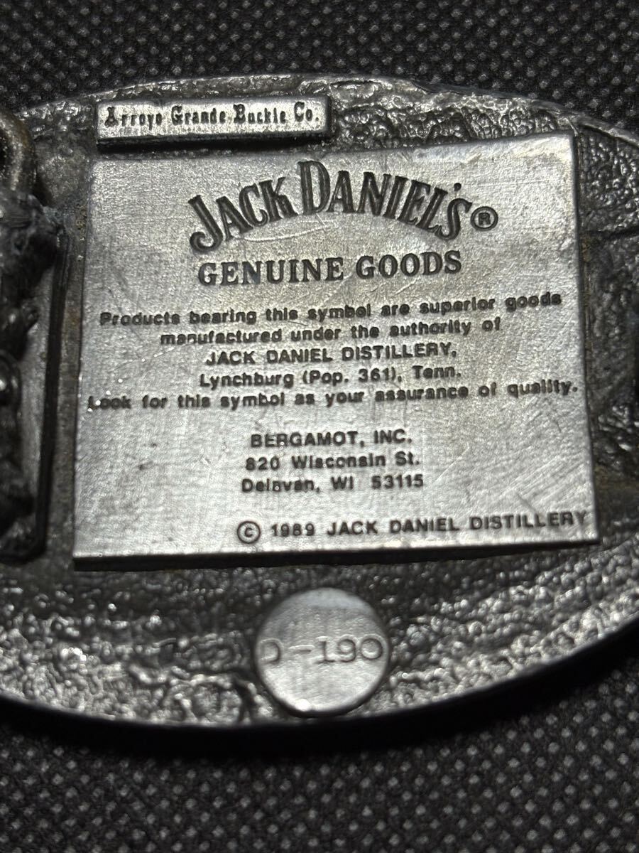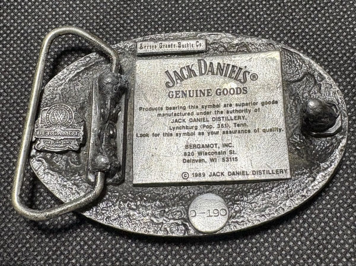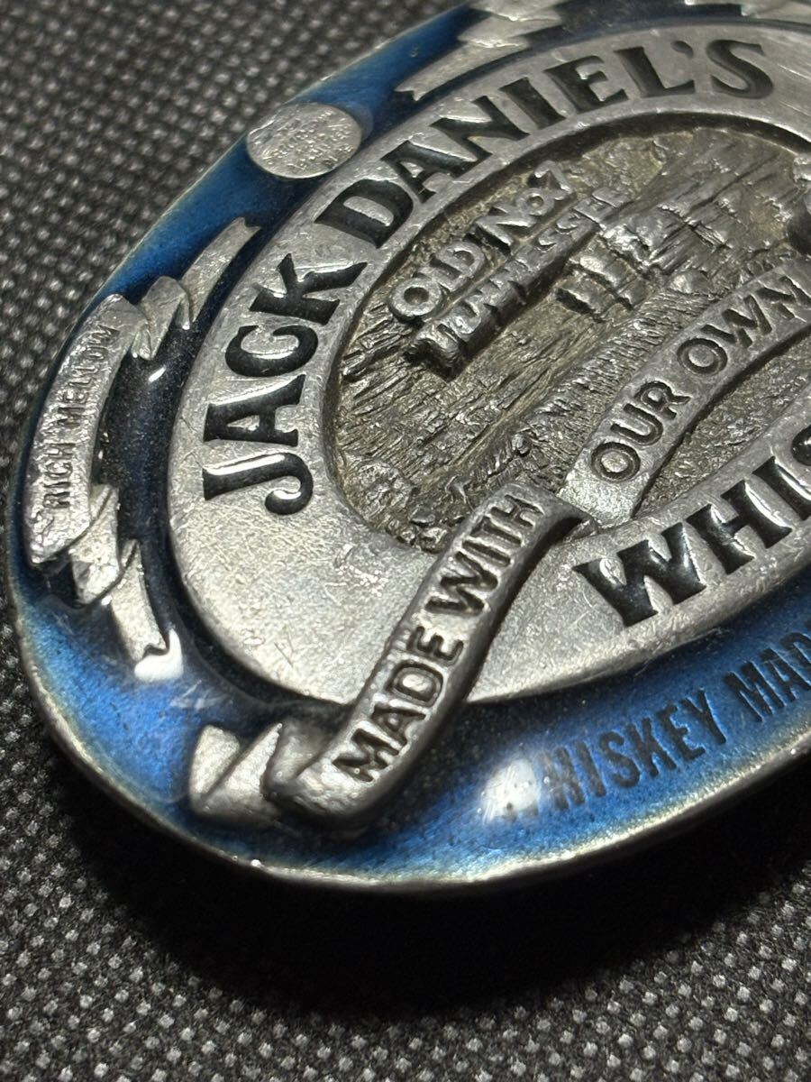 本品はアメリカBergamot, Inc.(Arroyo Grande Buckle Co.)によるライセンス生産品で、裏面には【1989 JACK DANIEL DISTILLERY/Bergamot, Inc./Delavan, WI】の刻印入り。メタル製の重厚感ある質感に、ブルーのエナメルがアクセントとなったデザインが魅力です。