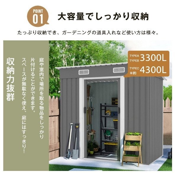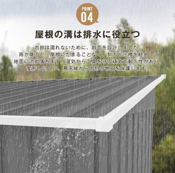 • 【屋根の溝は排水に役立つ】内部は濡れないために、斜面を設計しました。雨が降ると、屋根にたまることなく、斜面と凹槽を経由して地面に流れ落ちます。湿気から工具を守る頑丈で耐久性があり、変形しにくい、悪天候から内部の物品を保護します。