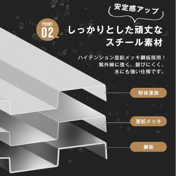• 【しっかりとした頑丈なスチール素材】ハイテンション亜鉛メッキ鋼板採用!紫外線に強く、錆びにくく、水にも強い仕様です。防水・防錆効果が優れている!