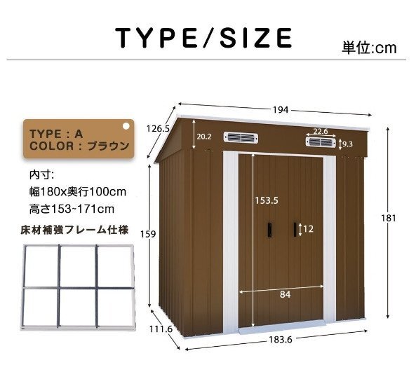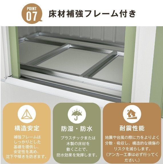 • 【床材補強フレーム付き】①構造安定:補強フレームはしっかりとした基礎を提供し、安定性を高め、沈下や傾きを防ぎます。②防湿・防水:プラスチックまたは木製の床材を敷くことで、防水効果を発揮します③耐震性能:地震や台風の際に力をよりよく分散・吸収し、構造的な損傷のリスクを減らします。(アンカー工事は必ず行ってください。)