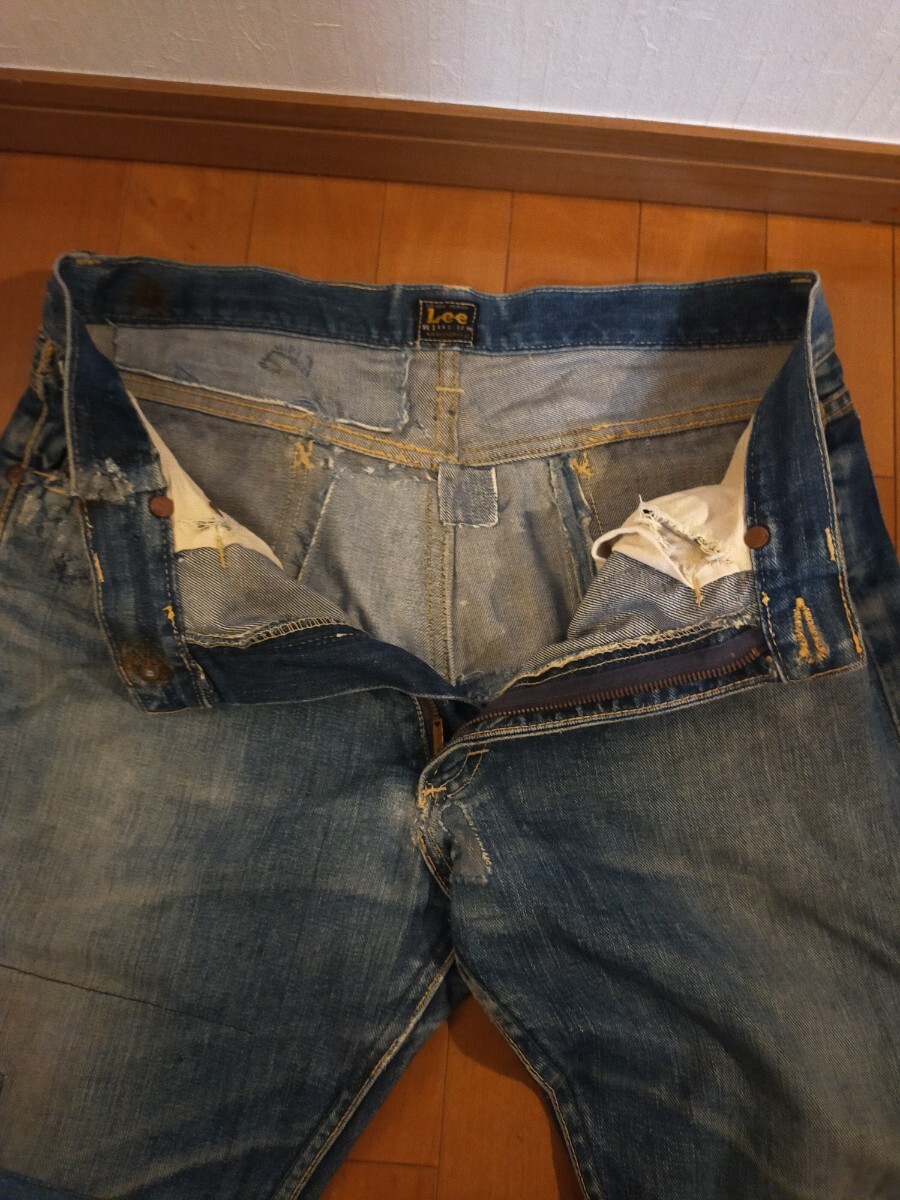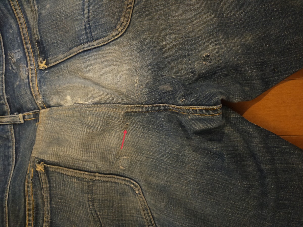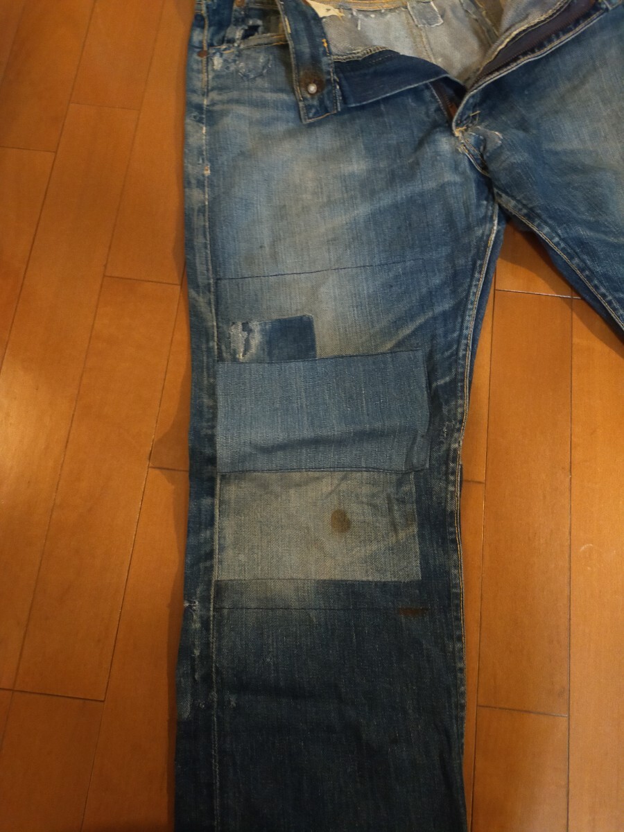 画像の通りビンテージ特有の貫禄があり、右ヒザ、ヒップ、右レングス後ろ部分のリペア含め雰囲気があります。左足に関しては特段ダメージありません。ヒップ左に5mm以下のピンホールがありますがリペアいただければ問題ない程度かと思います。また、ポケット内側に破れがありますが同様にリペアいただければ問題ないかと。