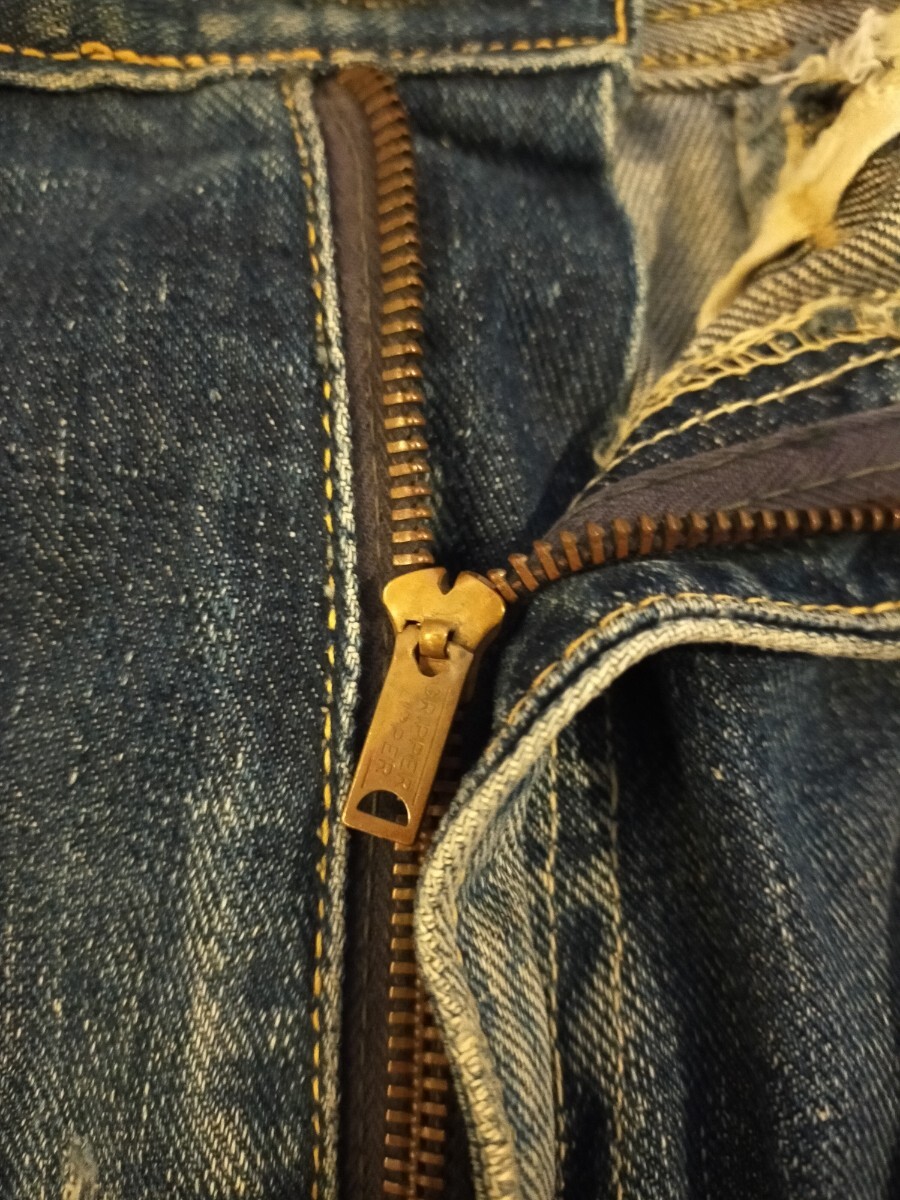 ジェームス・ディーンが映画「理由なき反抗」で着用したことでも知られる銘品。製造期間が僅か1年半という非常に玉数が少ない稀少種で、こちらはベルトループが5本ですので前身のセンター赤タグの名残りも感じさせる初期に分類される個体です。ZIPは片爪のGRIPPER、ピスネーム欠損していますがセンタータグ・その他ディテールからR・MR表記なしとの仕様と思われ市場に出るほとんどが片耳ですがこちらは脇割という点も稀少かと思います。