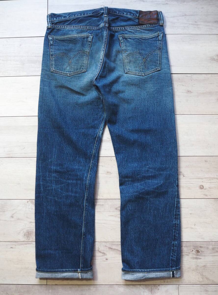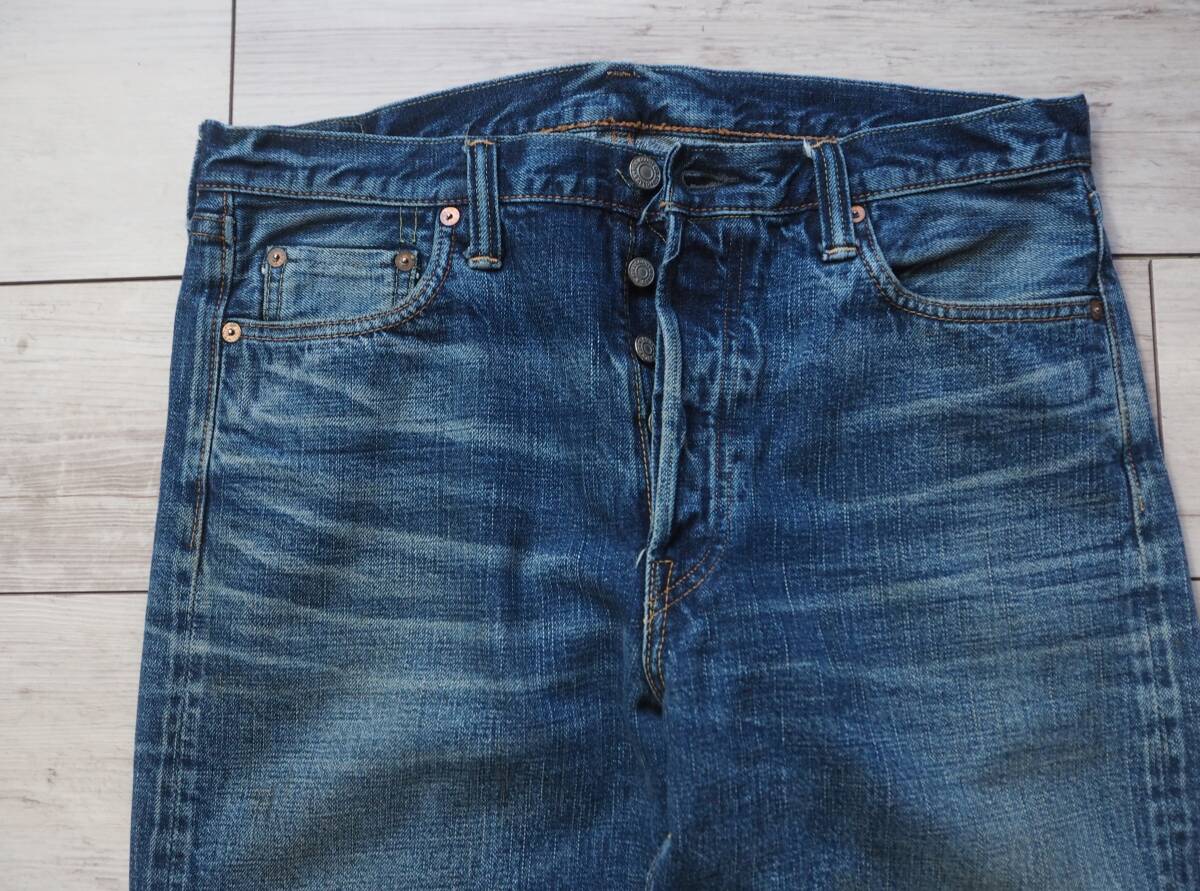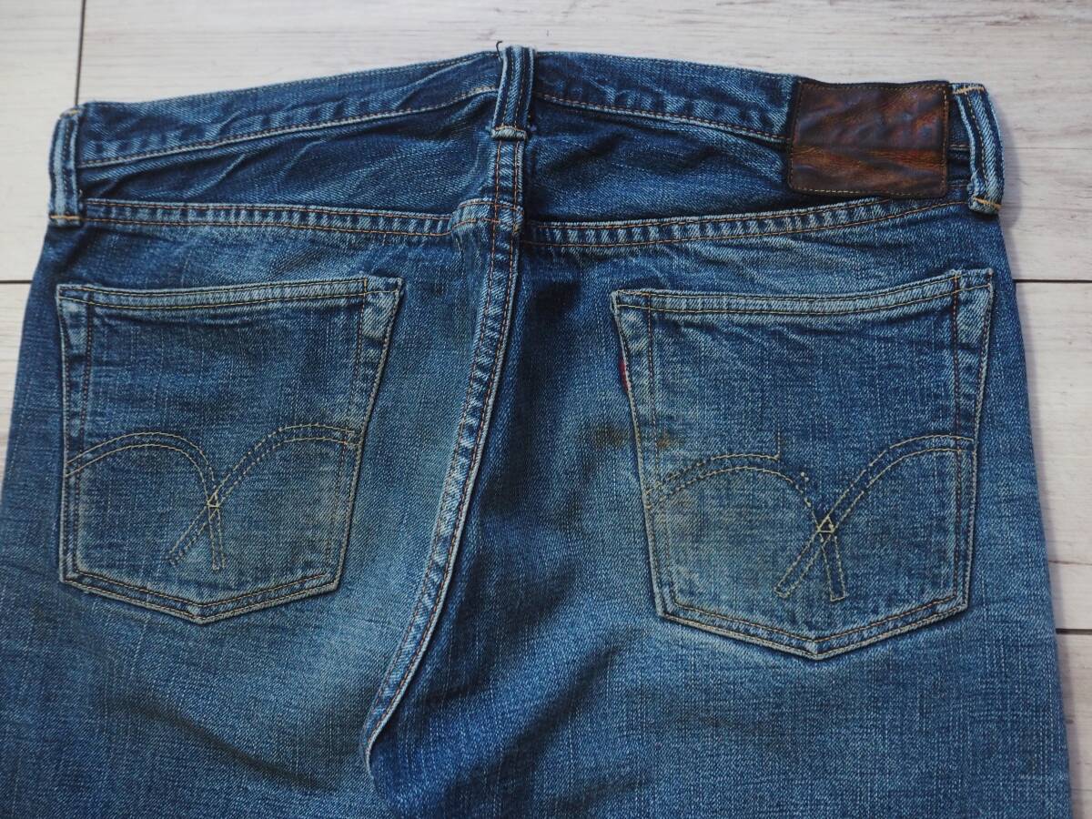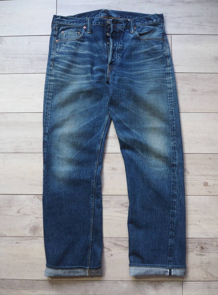 こちらはフルカウント/FULLCOUNT Lot.1101 STRAIGHT 定番モデルです。 フルカウントの定番ジーンズの中でもプレーンなストレートライン。1950年代以前の501xxを基本シルエットに着用際の秀逸なバックスタイルが特徴的です。 生地は極上の履き心地を体験できる高級な超長綿(ジンバブエコットン)を時間をかけて甘く織り上げ、ふんわりと馴染む様な伸縮性を持ちます。 フルカウント/FULLCOUNT Lot.1101 STRAIGHT 旧モデル アーキュエットステッチ 赤タブ付 size W34と思います。実寸参考にお願い致します。 素材 100% COTTON 13.7ozジンバブエコットン、ゴートレザーパッチ、中盛ベルトループ、裾チェーンステッチ。 MADE IN JAPAN 実寸 ウエスト 42.5cm x 2 85cm 丈 101cm 股上 前29cm 後36cm 股下 76cm 裾幅 21cm コンディション 当時のウォッシュ加工モデル。縦落ちはじめとしたインディゴの濃淡具合はヴィンテージを彷彿とされる風合いです。 裾の上げ具合も違和感がありません。 後部にお洗濯で残った古い汚れ跡こそありますがアジ感覚で着用して頂ける程度です。 宜しくお願い致します。 | ||||