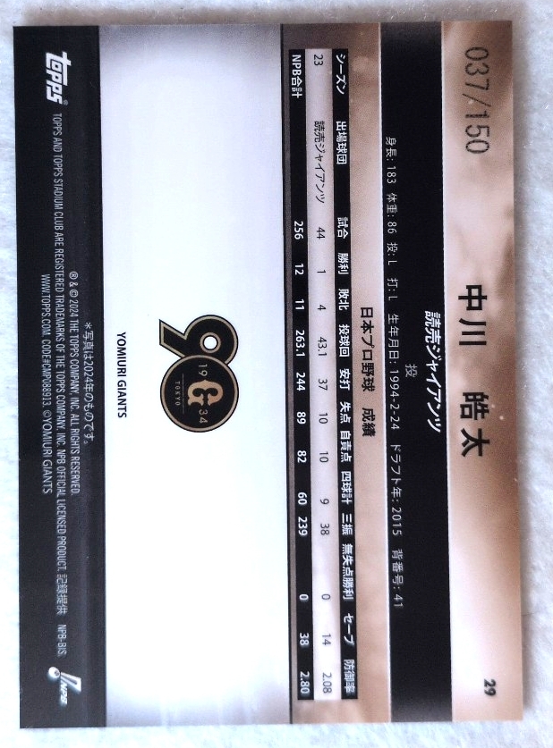 ★150枚限定★ 中川 皓太 阪神タイガース 37/150 TOPPS STADIUM CLUB 2024