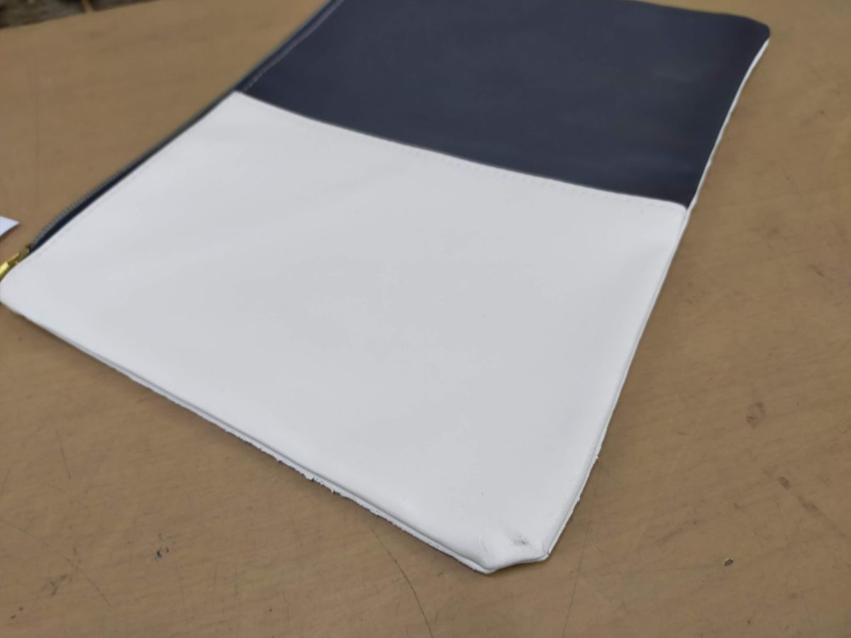 ピンク×ホワイトの斜め切り替えデザインと、裏面のホワイト×ネイビーのバイカラーが特徴的。