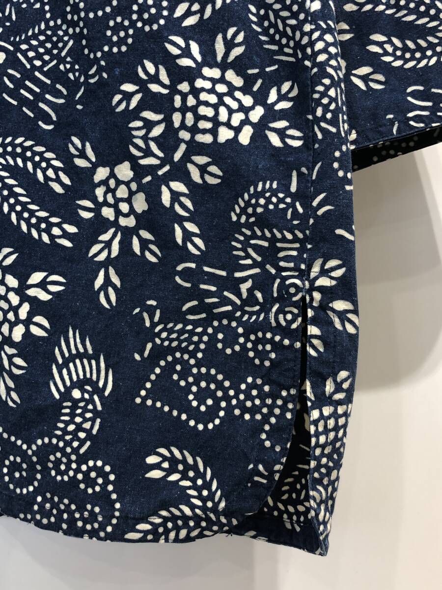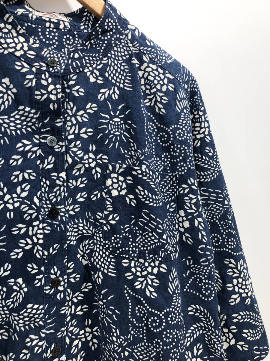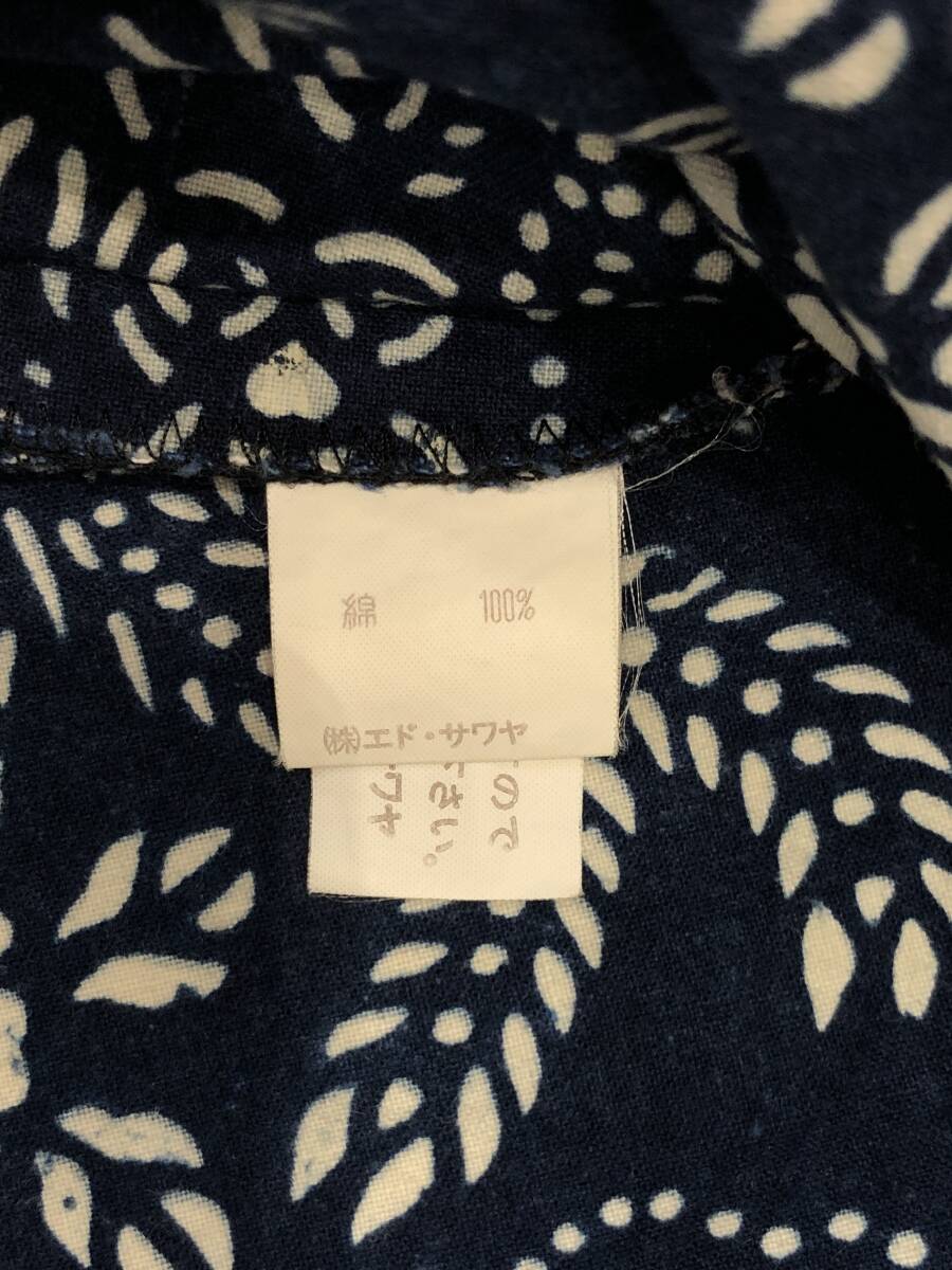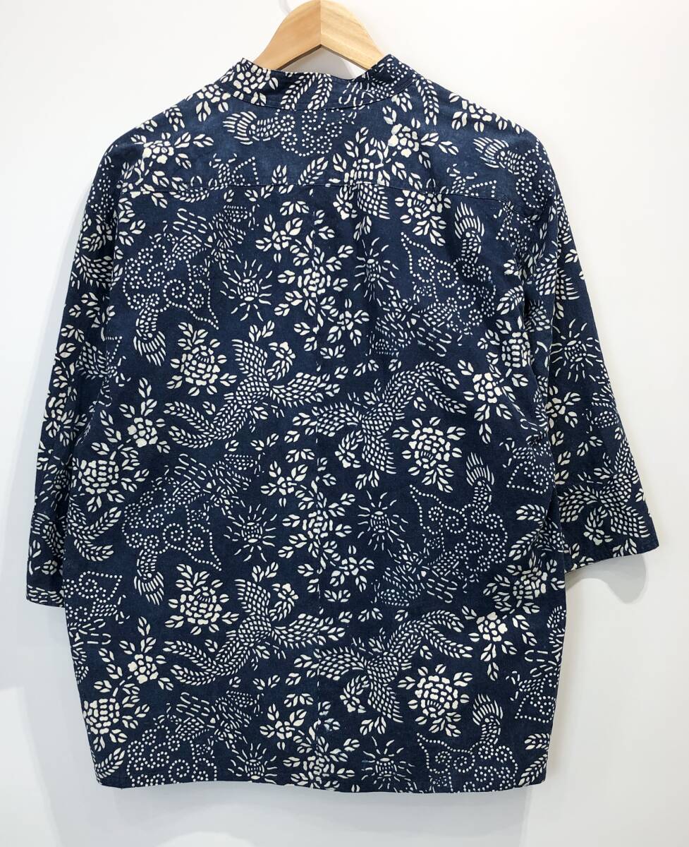 EDO-SAWAYA 藍染 バンドカラー シャツ 七分袖 胸ポケット付き 総柄 ネイビー エドサワヤ 古着 レトロ■0929H |