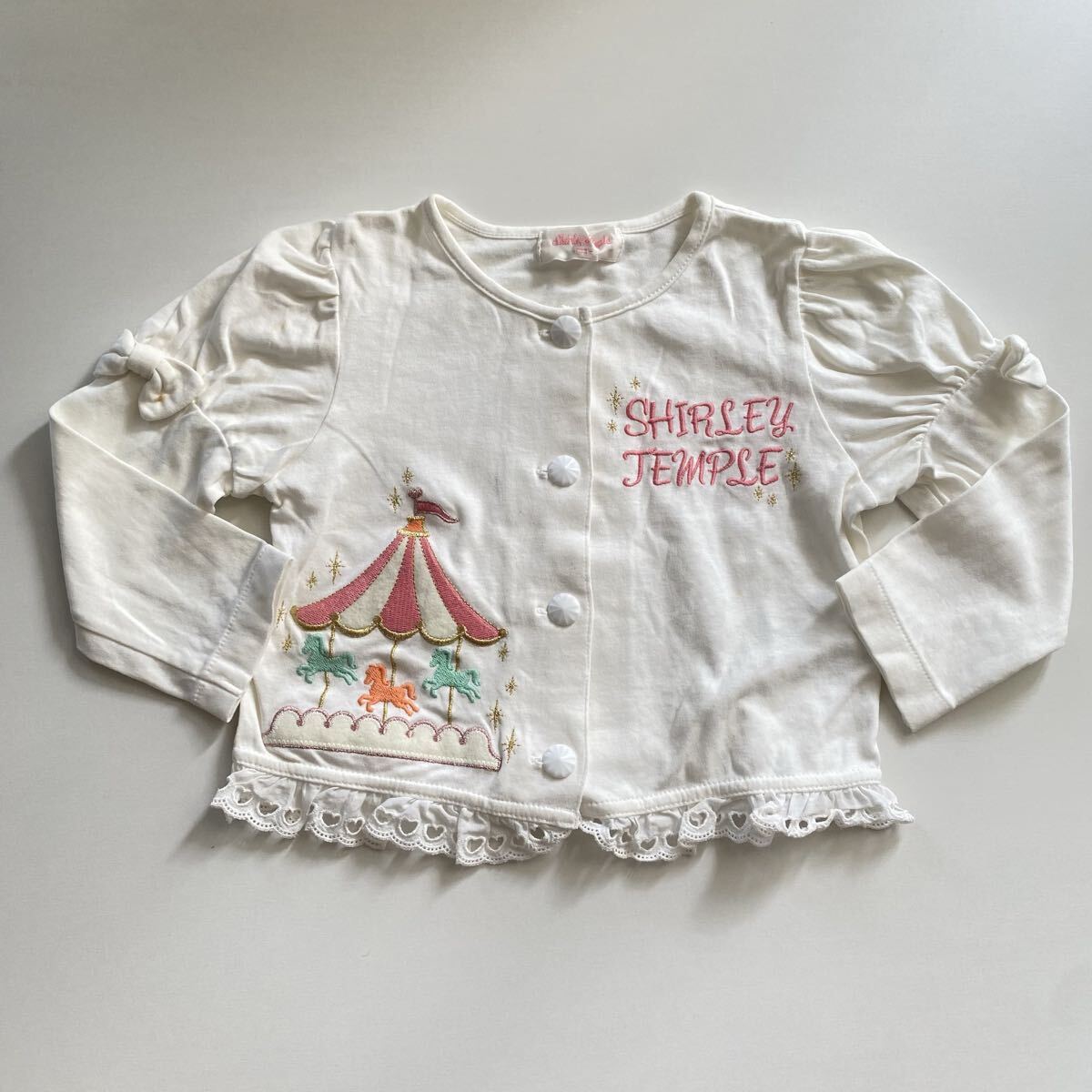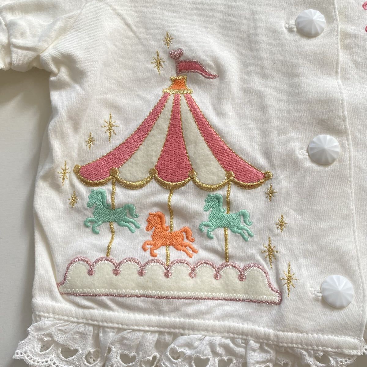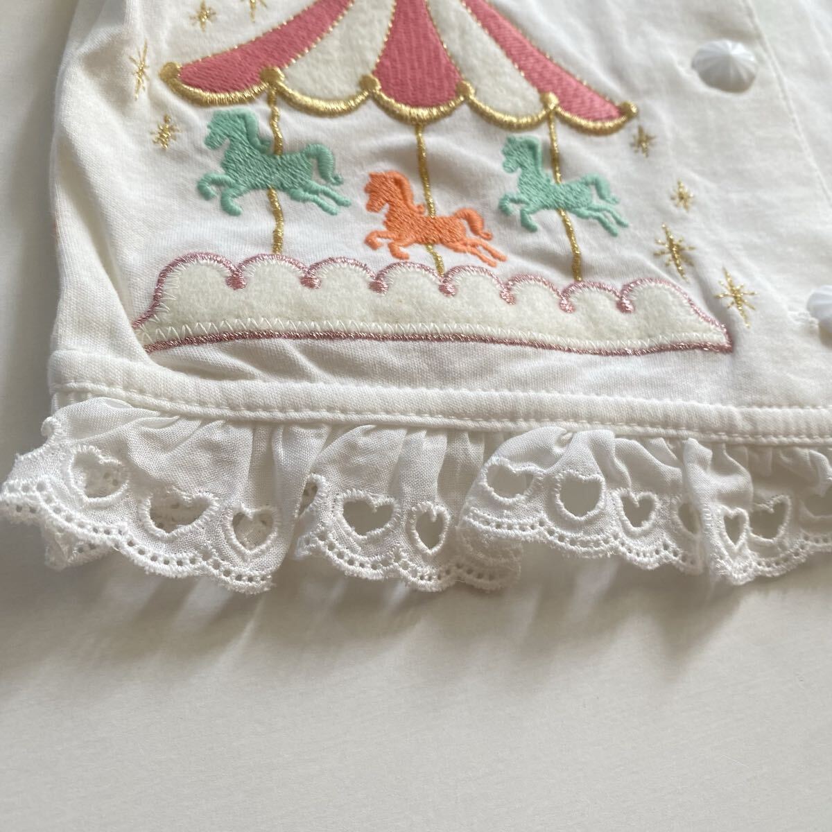 メリーゴーランドの刺繍、裾はハートのパンチングレース、腕にはリボンがありとても可愛いです。