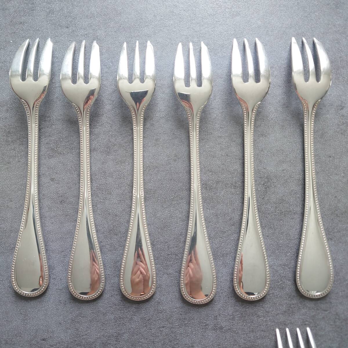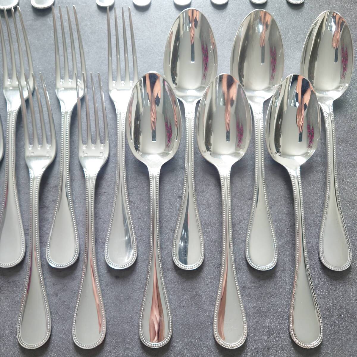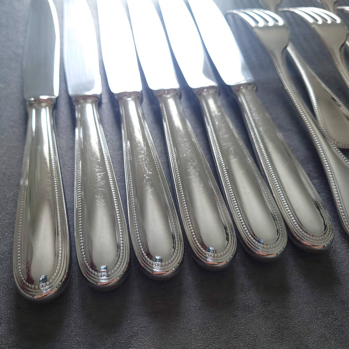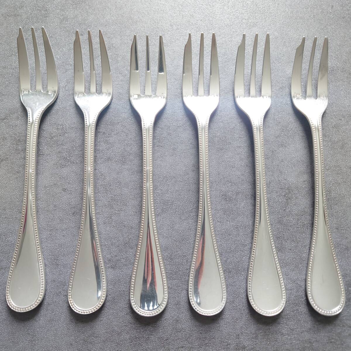 カトラリー同士の接触傷や使用に伴う小傷、お手入れによるスレやくすみなどが多少ありますが、比較的状態は悪くないお品物と個人的には考えております。