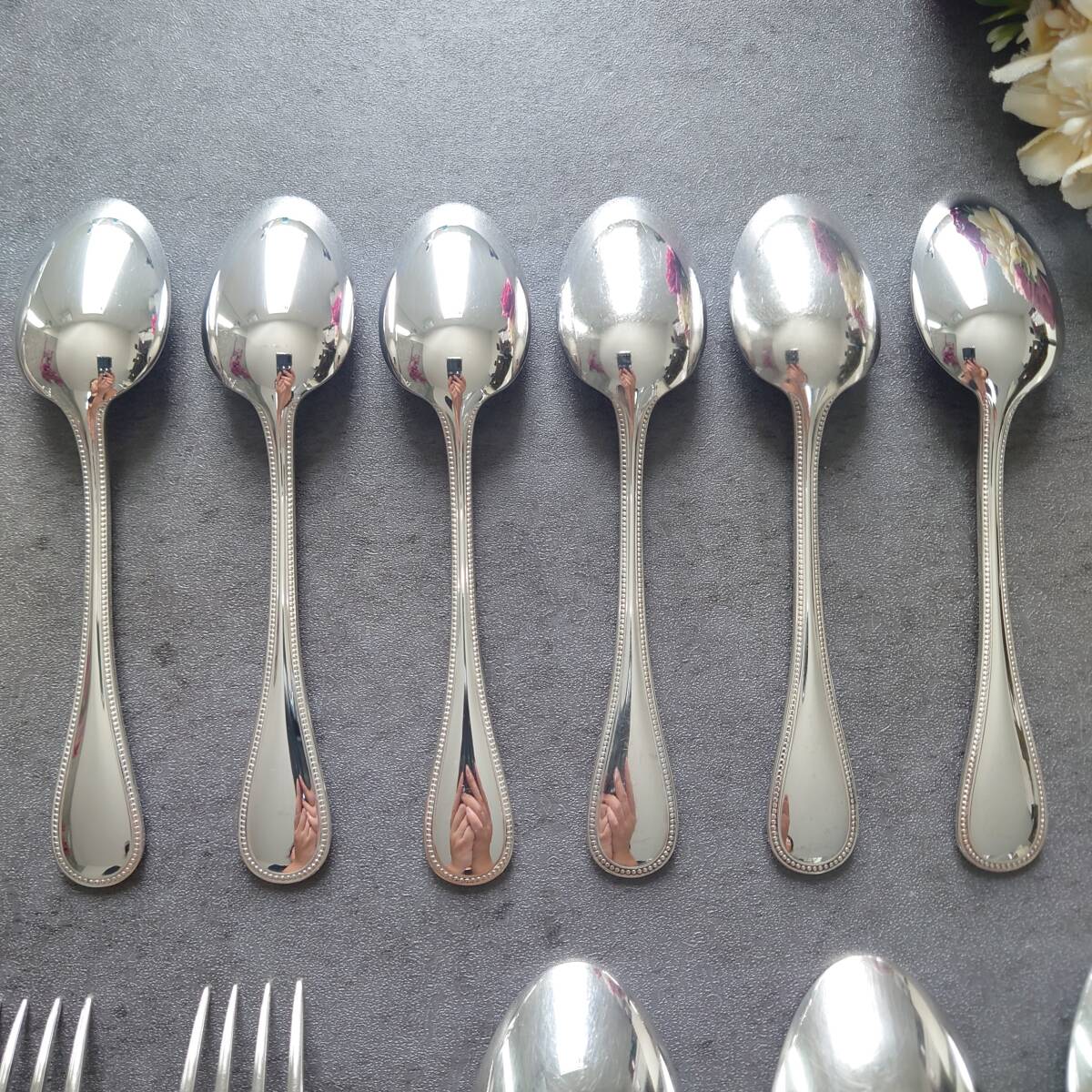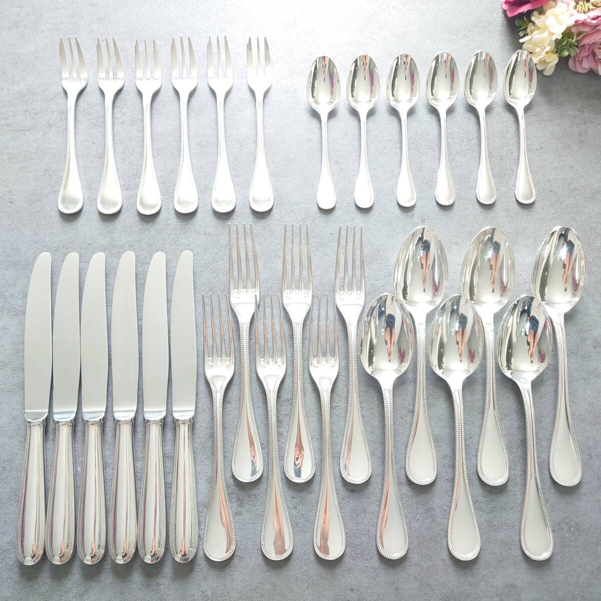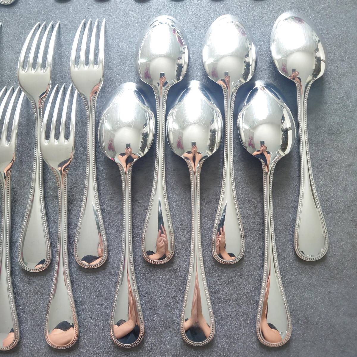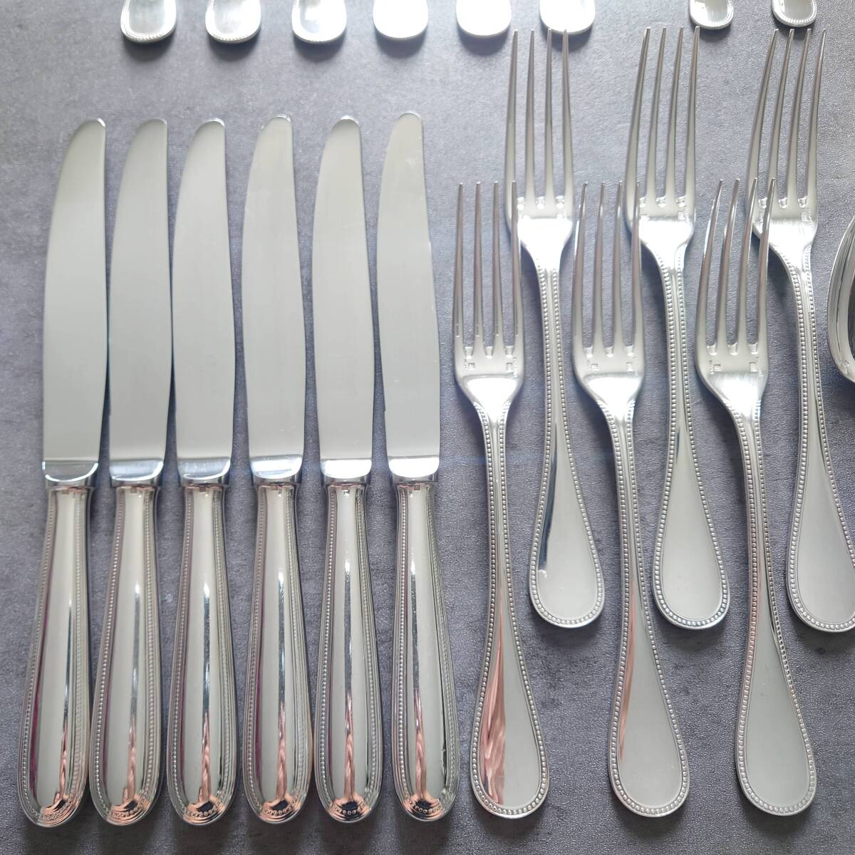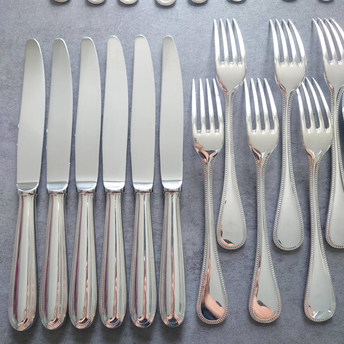 カトラリー同士の接触傷や使用に伴う小傷、お手入れによるスレやくすみなどが多少ありますが、比較的状態は悪くないお品物と個人的には考えております。