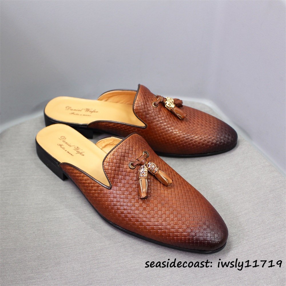 極美品★定価9万超 レザーシューズ 本革 編み込み ハンドメイド ビジネスシューズ スリッポン 紳士靴 牛革 革靴 スリッパ ブラウン 27.0cm