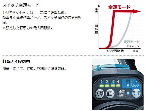 トリガを少し引けば、一気に全速回転。効率よく連続作業が行え、疲労も軽減。