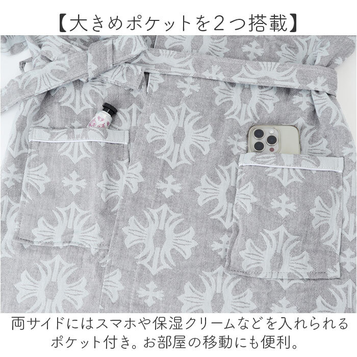 | 商品説明 | ・・【ふわふわで優しい着心地】 ・綿100%の高密度2重ガーゼのバスローブ♪ ・【オールシーズン対応】 ・通気性、速乾性も優れ、汗をかく季節も快適に着用できる◎ ・【大きめポケットを2つ搭載】 ・両サイドにはスマホや保湿クリームなどを入れられるポケット付き。お部屋の移動にも便利。 ・【多彩なシーンで使える】 ・自宅でのリラックスタイムから温泉旅行まで幅広く活躍◎ |