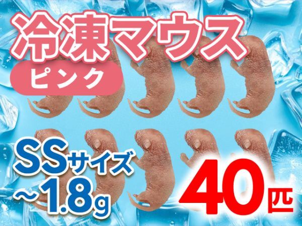 ◎新鮮な状態で冷凍処理されたマウスです。 ◎冷凍状態でクール便にてお届けします。日持ちするので買い置きに便利です。 ◎爬虫類 両生類 猛禽類などのエサにおススメです。 ◎ジップロックなどに入れて50-70℃程度の湯せんで完全に解凍してから与えてください。 ◎【商品詳細】ピンク SS ~1.8g 40匹入り |