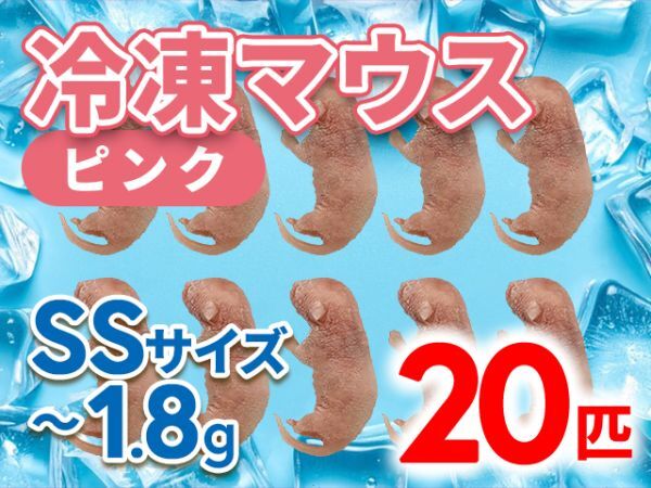 ◎新鮮な状態で冷凍処理されたマウスです。 ◎冷凍状態でクール便にてお届けします。日持ちするので買い置きに便利です。 ◎爬虫類 両生類 猛禽類などのエサにおススメです。 ◎ジップロックなどに入れて50-70℃程度の湯せんで完全に解凍してから与えてください。 ◎【商品詳細】ピンク SS ~1.8g 20匹入り |