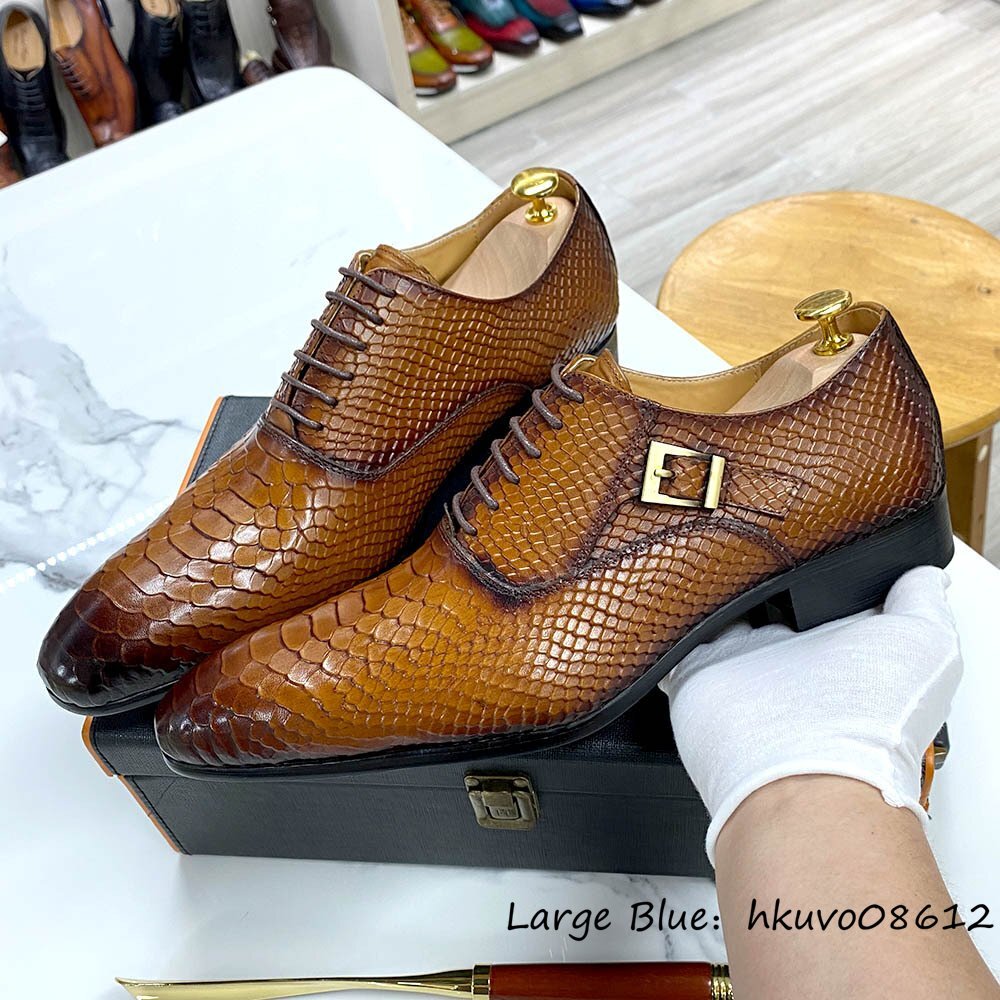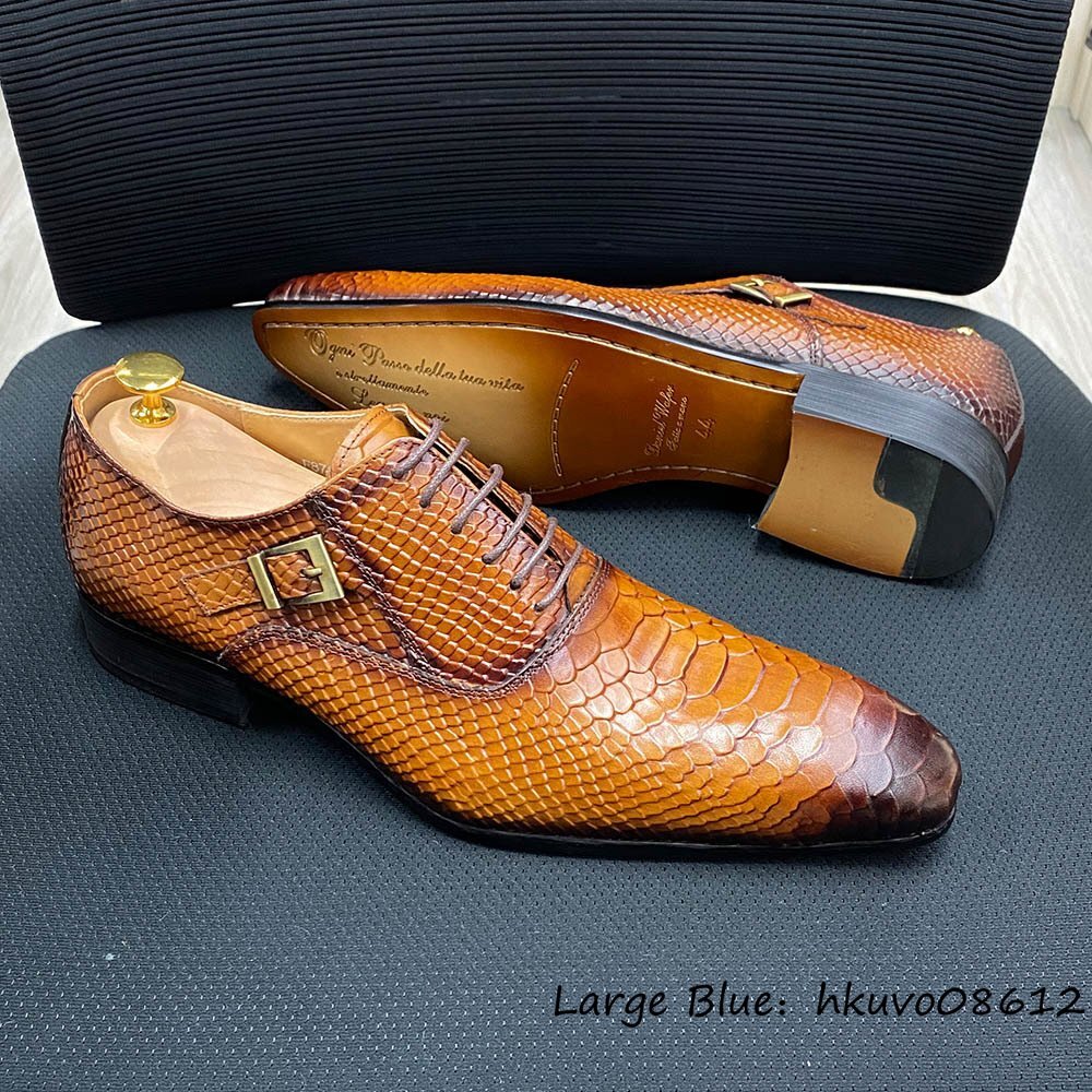定価10万■本革 ドレスシューズ 蛇柄 職人手塗り上げ ビジネスシューズ 上質牛革 レザーシューズ 革靴 紳士靴 フォーマル ブラウン 25.0cm